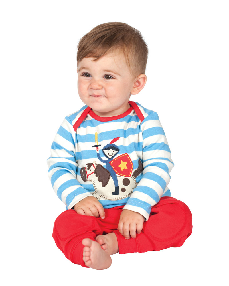 - Fantasia/Colore: Fantasia a righe Blu e Bianche e favolosa Applique sul davanti con Cavaliere a Cavallo nelle tonalità del Blu, Bianco, Marrone e Rosso. I colori impiegati sono atossici certificati GOTS, senza uso di composti Azoici, metalli pesanti, formaldeide, cloro o sbiancanti ottici.