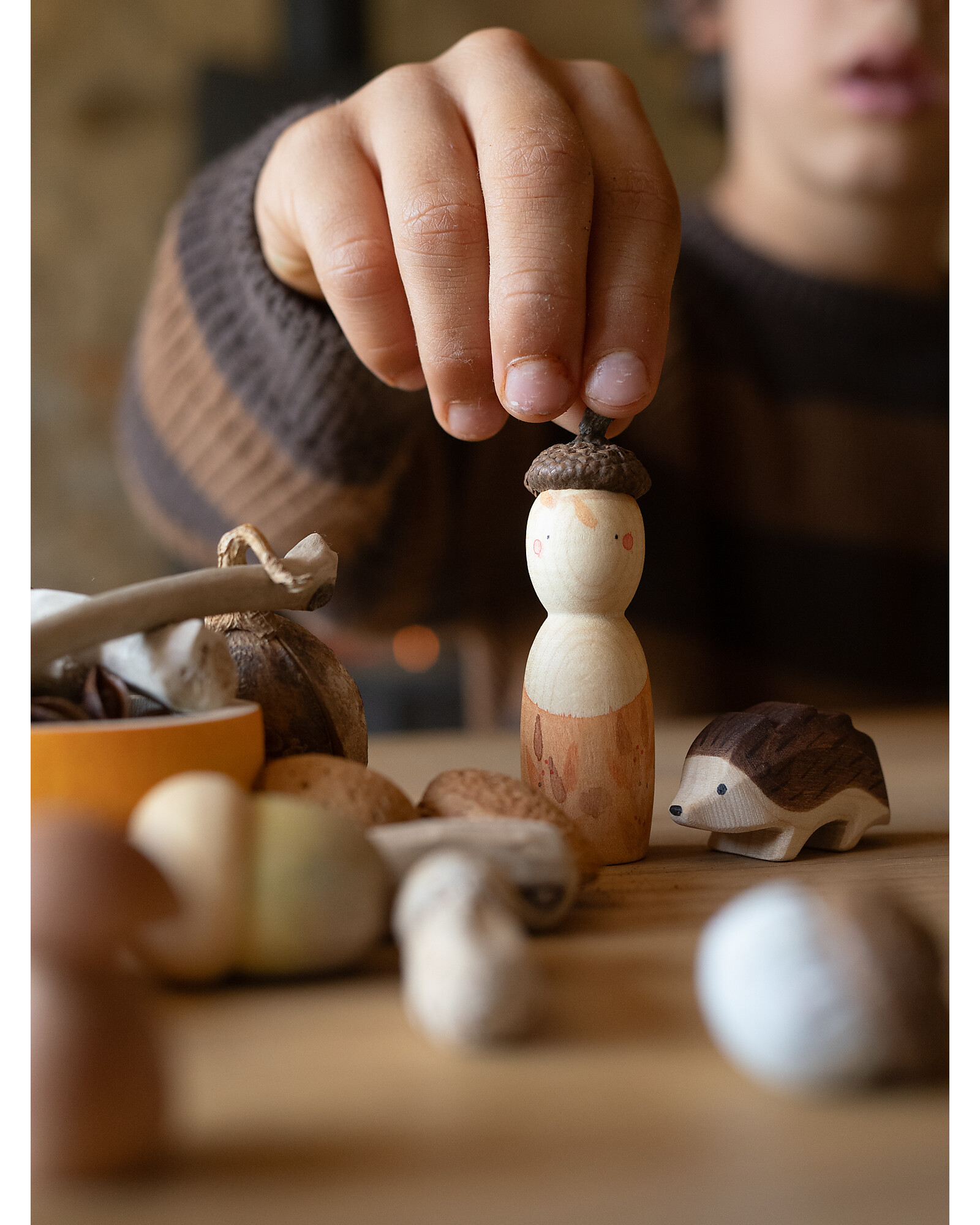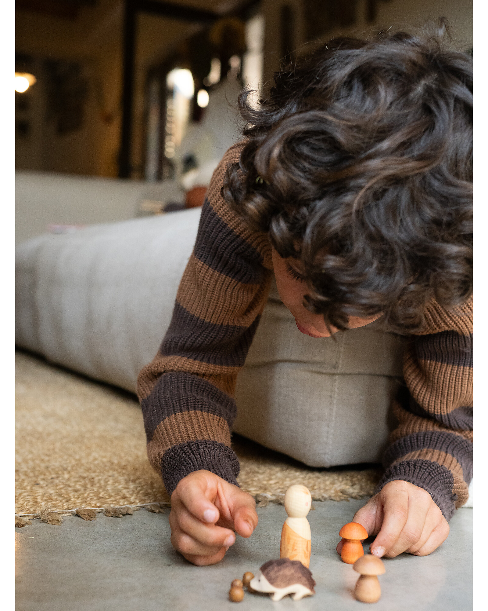 Grapat – Hello Autumn è un set che cattura la magia dell’autunno. Al suo interno, trovi figure in legno, pensate per stimolare il gioco libero, l’immaginazione e la curiosità dei bambini. Con questo set, i piccoli possono creare mondi incantati, inventare storie autunnali e giocare con le sfumature calde di marrone, ocra, arancione e verde – i colori più belli di questa stagione. Ogni pezzo è realizzato a mano, levigato e trattato con tinte naturali, delicato al tatto. Hello Autumn è il gioco che celebra il cambiamento delle stagioni, un regalo che unisce natura e autenticità.