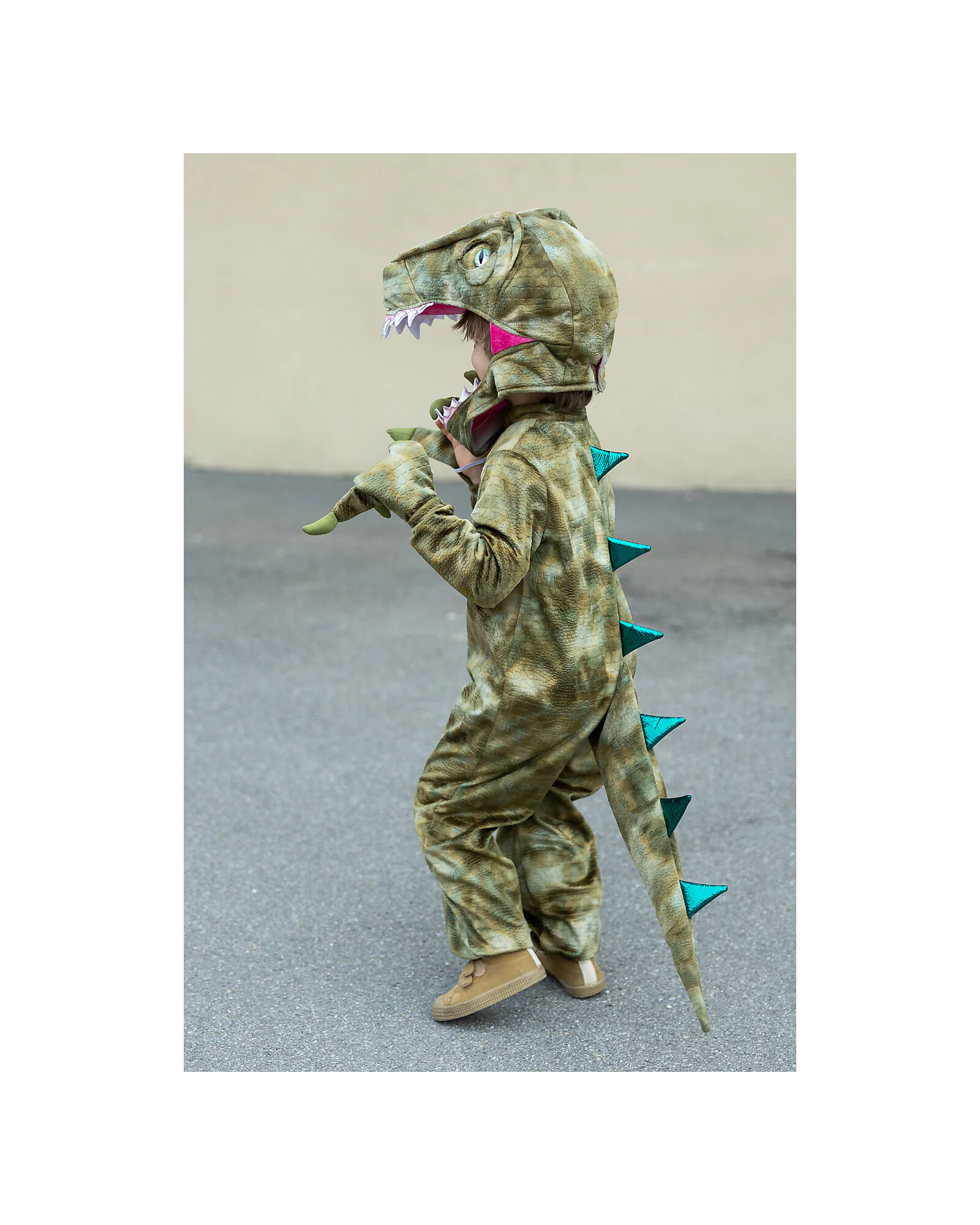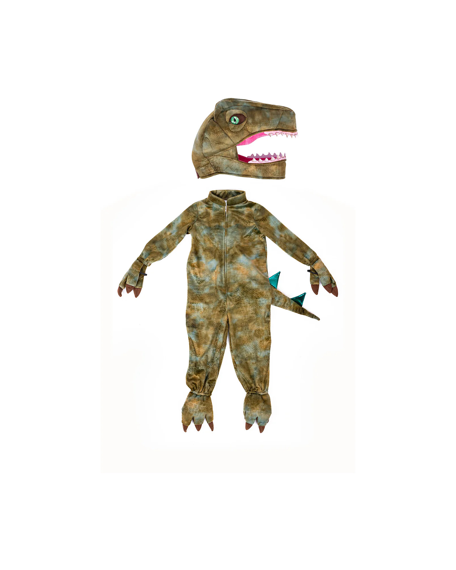 La coda lunga con spuntoni verde metallizzato segue ogni movimento, aggiungendo un effetto scenografico che rende il costume davvero speciale. La testa di raptor imbottita, curata nei dettagli di occhi e denti, completa il look e rende l’esperienza di gioco ancora più immersiva.