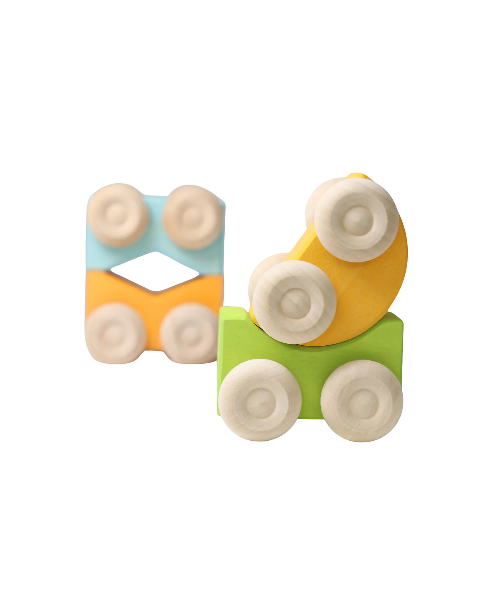 Le nostre Stacking Cars sono molto più di semplici giocattoli: sono un invito a vivere l'avventura con fantasia. Ogni macchina può impilarsi con le altre, creando spettacolari torri in movimento, oppure sfrecciare veloce su qualsiasi superficie grazie alle sue ruote levigate. I bambini possono anche costruirci sopra, trasformandole in veicoli unici e personalizzati. I colori vivaci e le forme diverse insegnano in modo naturale l’armonia cromatica e il concetto di associazione tra forme. Realizzate in legno di tiglio colorato e ruote in legno d’acero, offrono una sensazione calda e autentica al tatto. Un gioco semplice, ma pieno di magia e potenziale creativo.