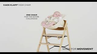 Il seggiolone evolutiva KLAPP di KAOS unisce design elegante e funzionalità intelligente. Realizzato in legno premium certificato FSC, offre una struttura solida e sostenibile. La sua ispirazione architettonica a una scala permette una seduta ergonomica, con gradini fissi su cui il bambino può salire e scendere in autonomia, favorendo un senso di indipendenza. Il KLAPP arriva già montato: basta aprirlo, bloccare il sedile, ed è pronto all’uso, senza bisogno di regolazioni. Si richiude in pochi secondi fino a uno spessore di soli 13 cm, ideale per spazi ridotti o per viaggiare. Ha una portata massima elevata, potendo così accompagnare il bambino dall’infanzia fino all’età adulta. Le superfici lisce sono facili da pulire con un panno. Il seggiolone è certificato secondo i più alti standard, garantendo sicurezza e qualità.