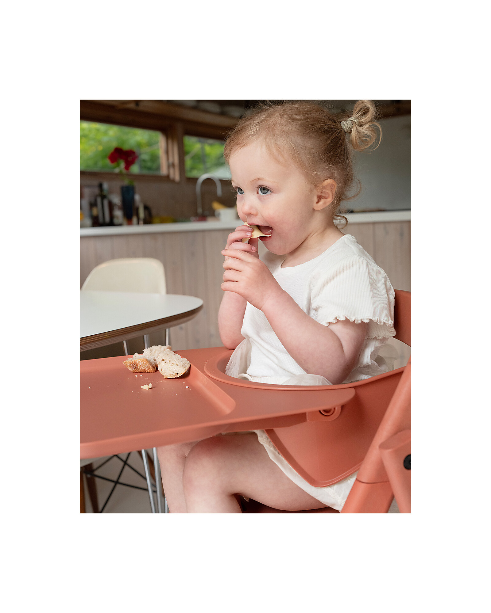 Il vassoio ampio e pratico offre tutto lo spazio necessario per piatti, bicchieri, snack e piccoli giochi, aiutando il bambino a concentrarsi sul cibo e incoraggiandolo a sviluppare autonomia durante la pappa. Si aggancia alla sponda di sicurezza in un attimo e resta ben fermo durante l’uso grazie alla progettazione intelligente e ai materiali resistenti.