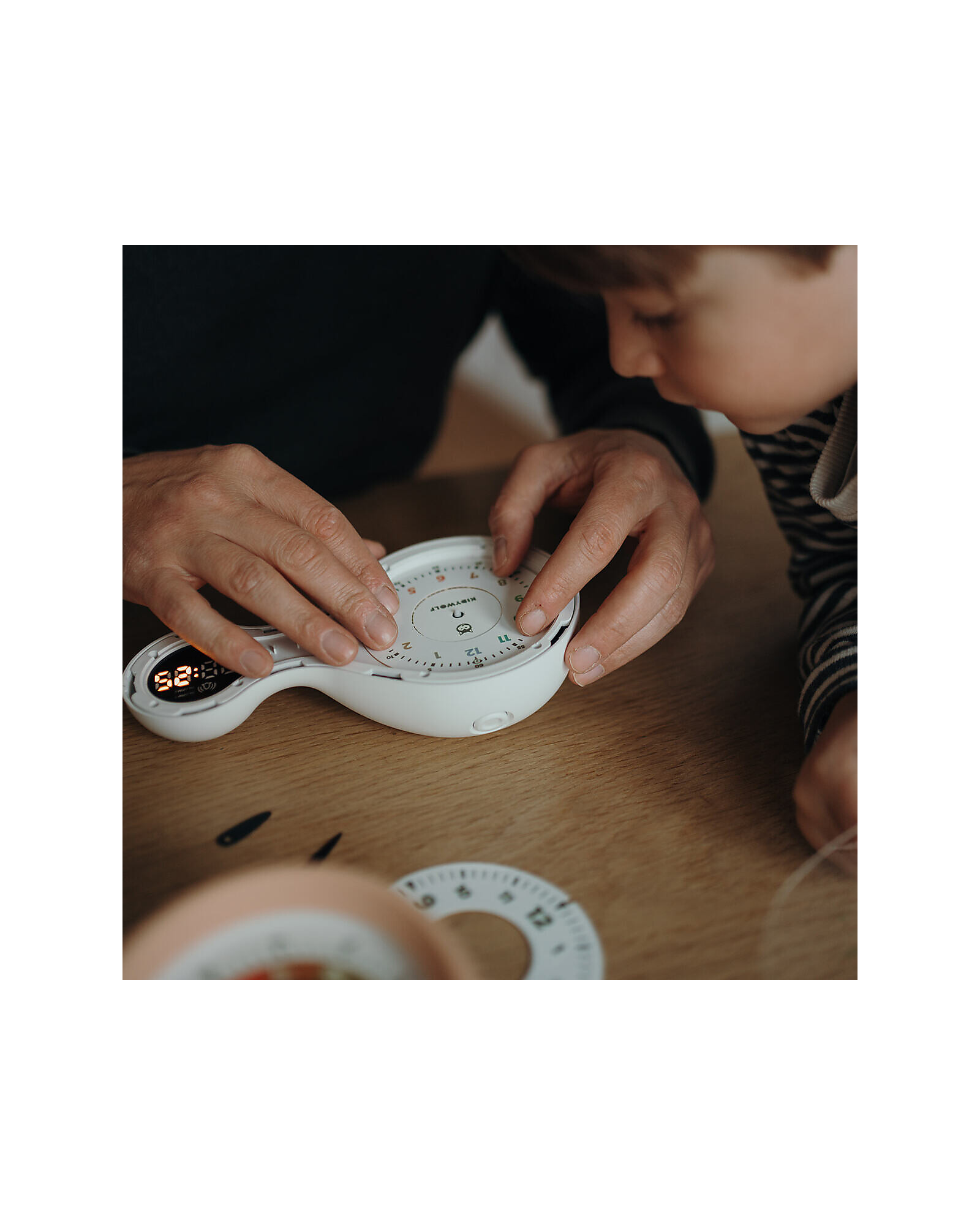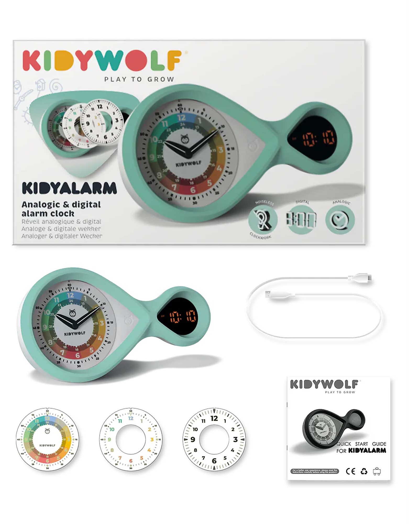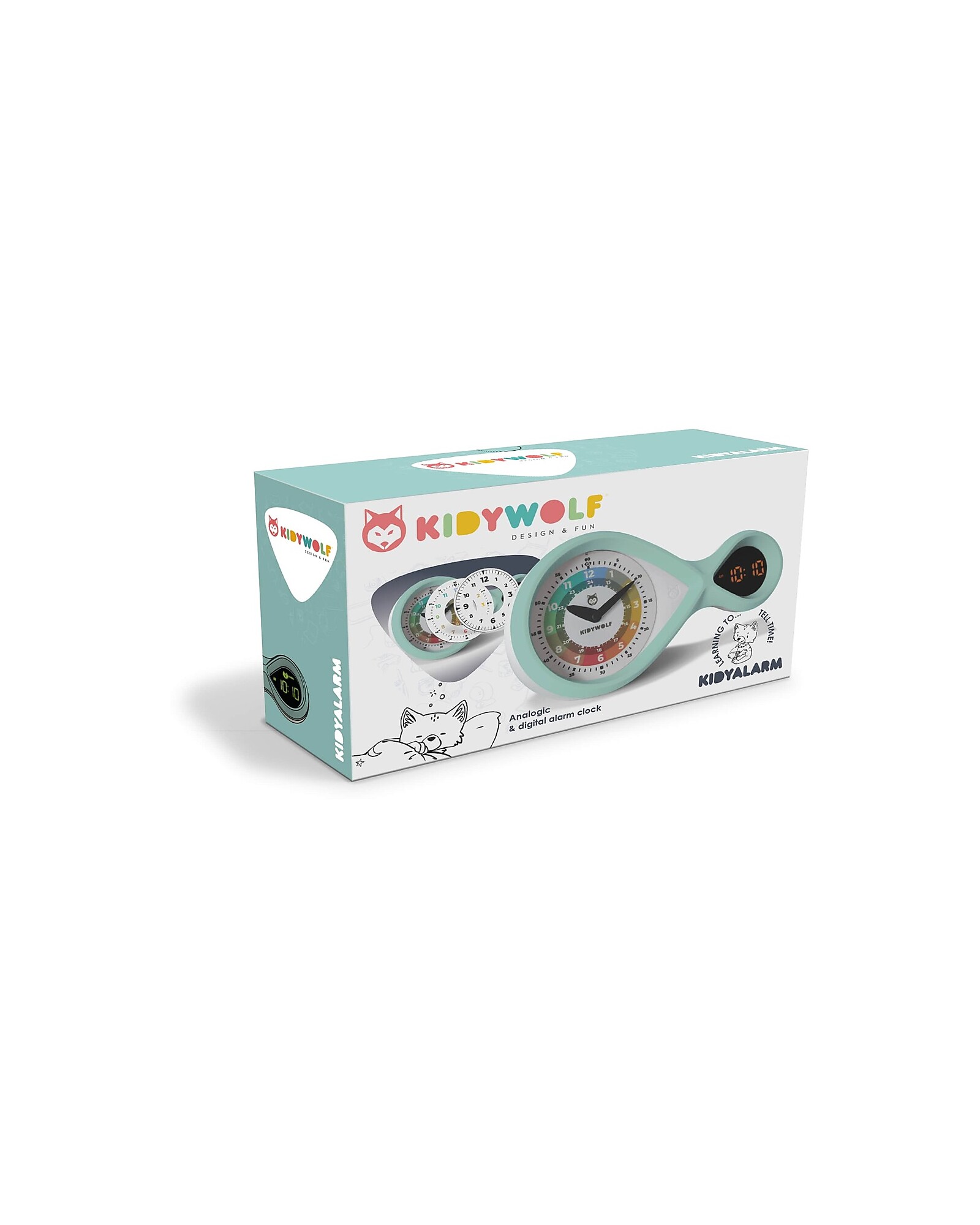 Con il suo display digitale e i tre quadranti intercambiabili, si adatta all’età e alle capacità del bambino, dal colorato per i più piccoli al classico per i più grandi. Il design a forma di infinito e il display luminoso al buio rendono KIDYALARM un oggetto bello, pratico e perfetto per la cameretta.