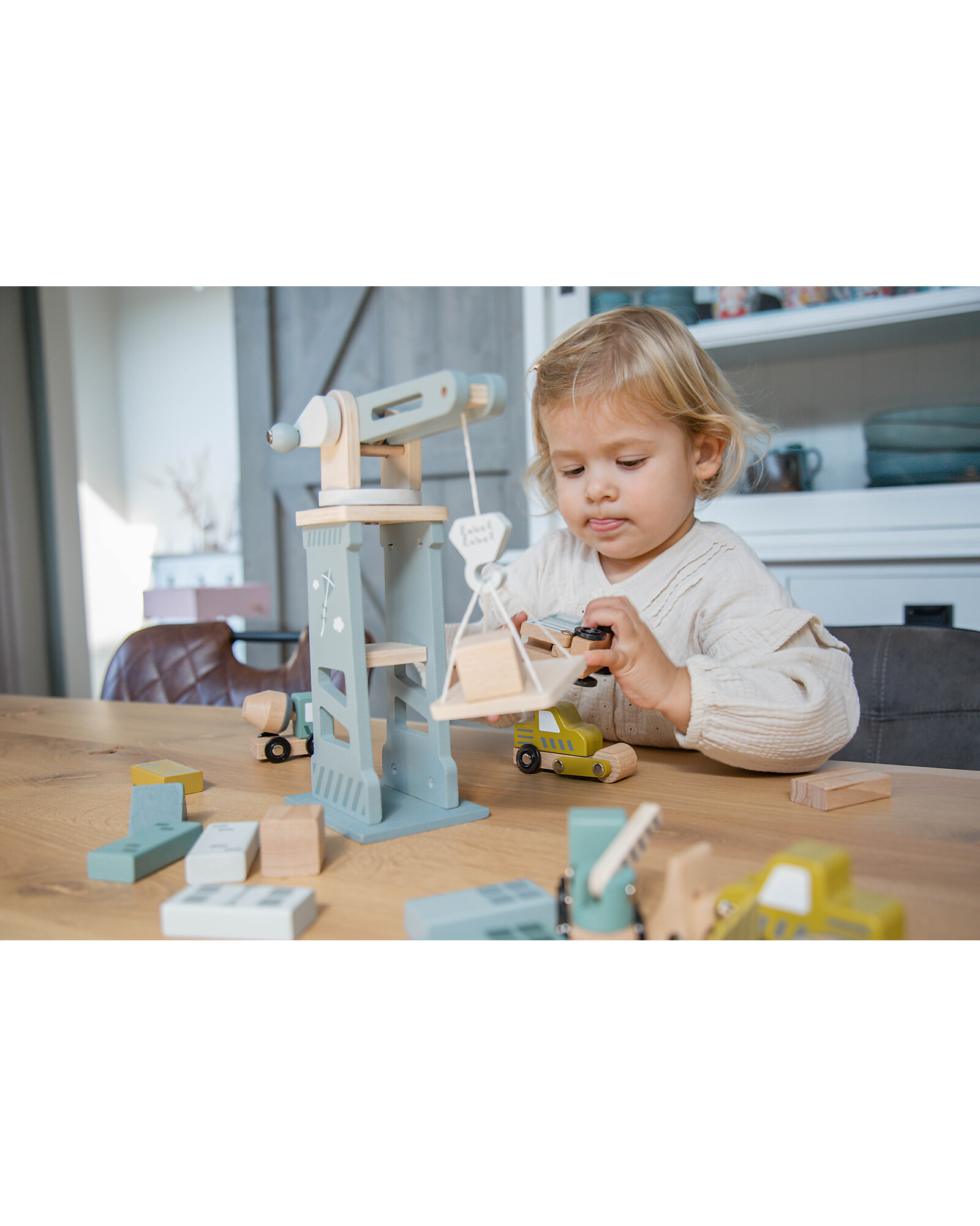 - Il set include: da una gru, 6 veicoli da cantiere, una pedana, 13 blocchi da costruzione e un segnale stradale.
