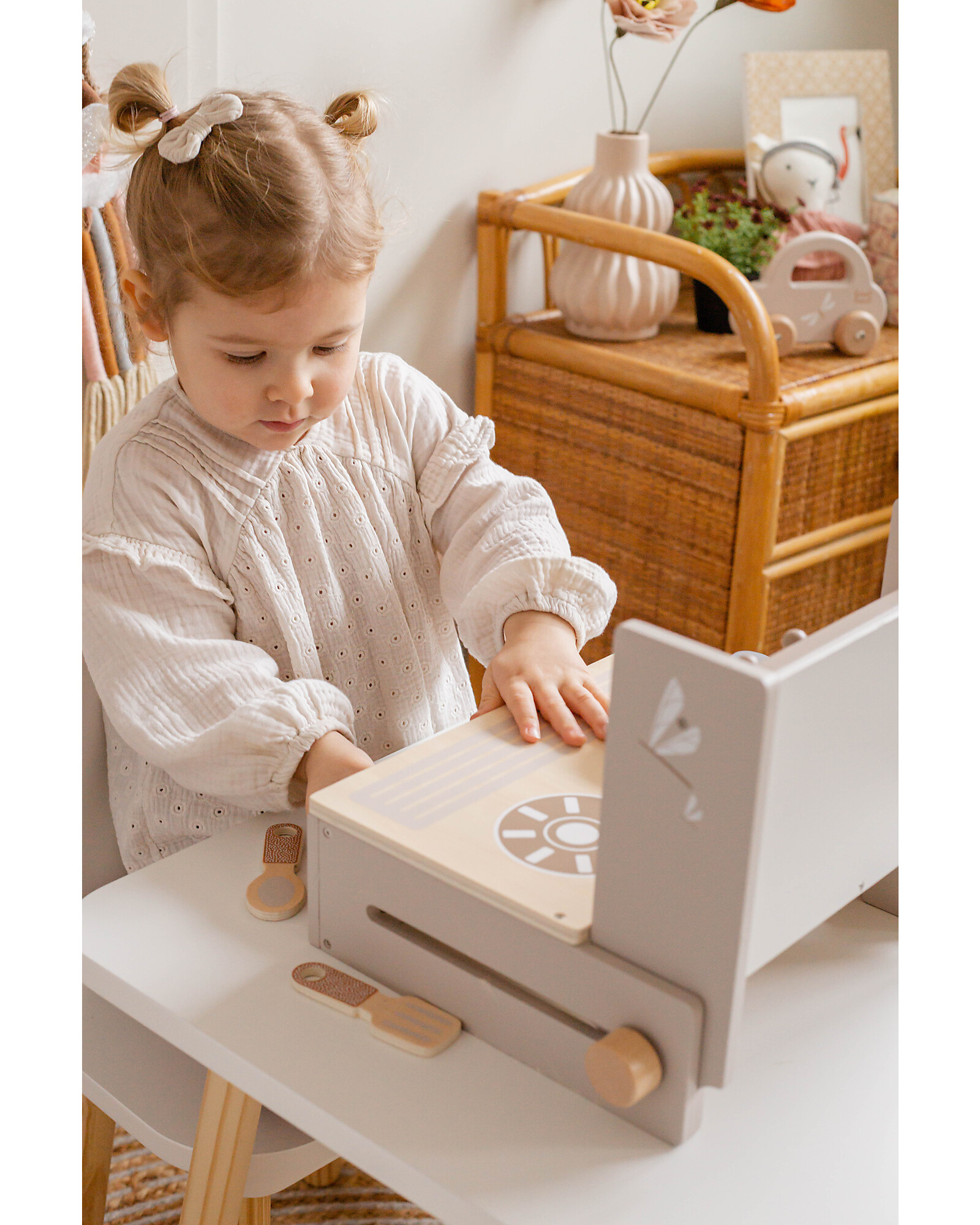 La Mini Cucina Pieghevole in Legno è il gioco perfetto per piccoli chef che amano imitare i grandi e cucinare con fantasia. Realizzata in legno di faggio certificato FSC, questa cucina garantisce qualità, sicurezza e sostenibilità, rispettando l’ambiente e la pelle delicata dei più piccoli grazie all’uso di vernici ad acqua atossiche. Il suo design pieghevole la rende pratica da riporre e trasportare. Completa di dettagli realistici come fornelli e manopole, stimola il gioco simbolico, la creatività e lo sviluppo delle abilità motorie.