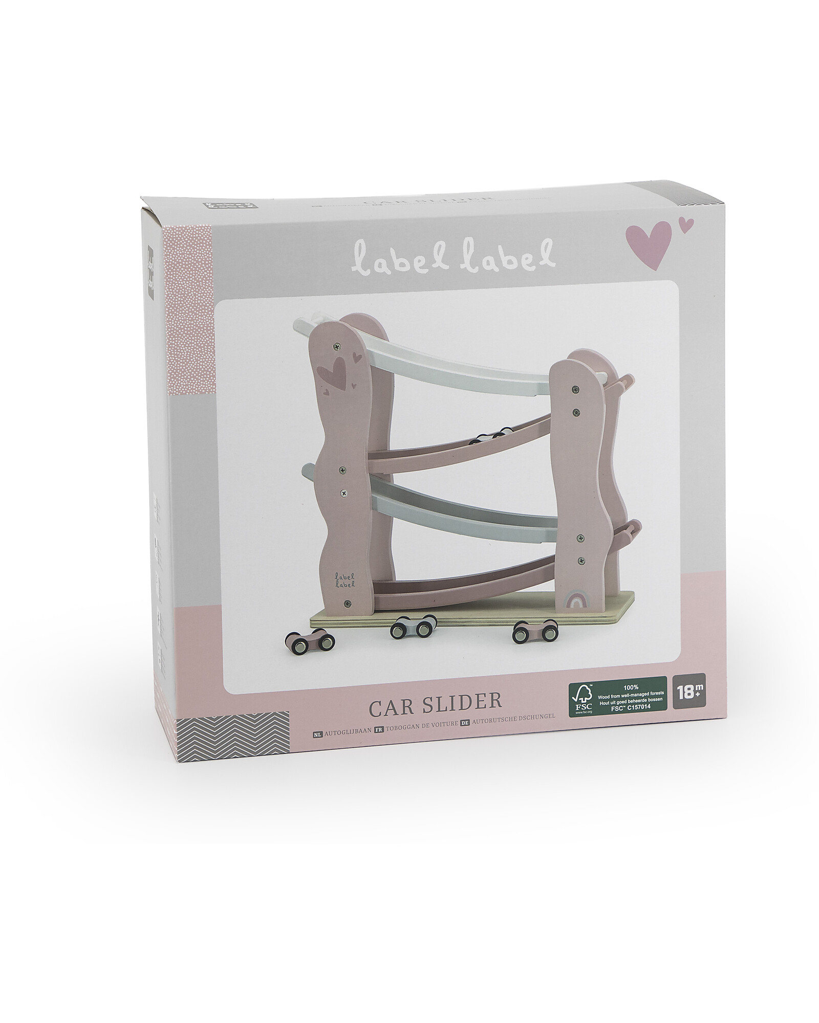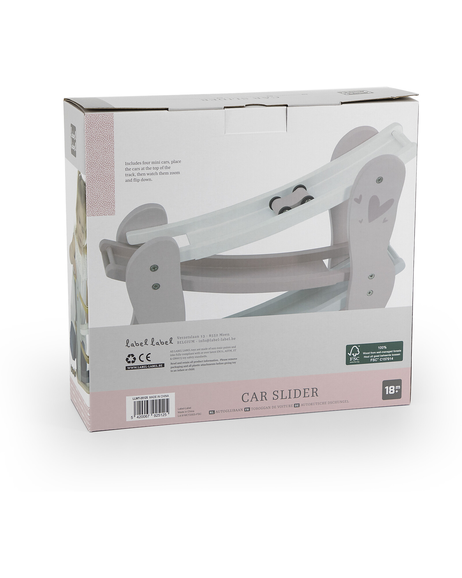 Questa divertente pista per auto di Label Label è realizzata in legno di faggio certificato FSC e dipinta con una vernice a base d'acqua sicura per i bambini.