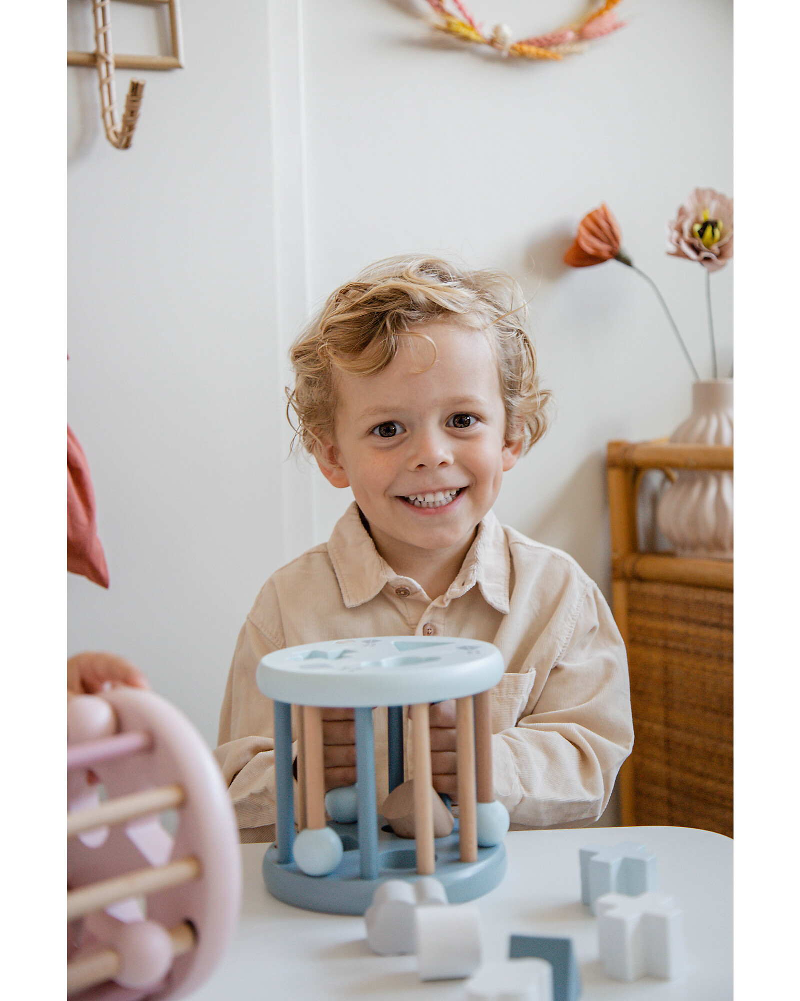 La Ruota con Forme Geometriche a Incastro di Label Label è un gioco educativo e divertente pensato per stimolare la curiosità e la coordinazione dei più piccoli. Realizzata in legno di faggio certificato FSC, garantisce resistenza, sicurezza e sostenibilità. La ruota contiene forme geometriche colorate da inserire negli appositi spazi, aiutando i bambini a riconoscere forme, colori e sequenze logiche. Una volta completata, può essere fatta rotolare, aggiungendo un ulteriore livello di gioco dinamico. Dipinta con vernici a base d’acqua, è completamente sicura. Il design curato e i colori tenui la rendono anche un bel complemento d’arredo.