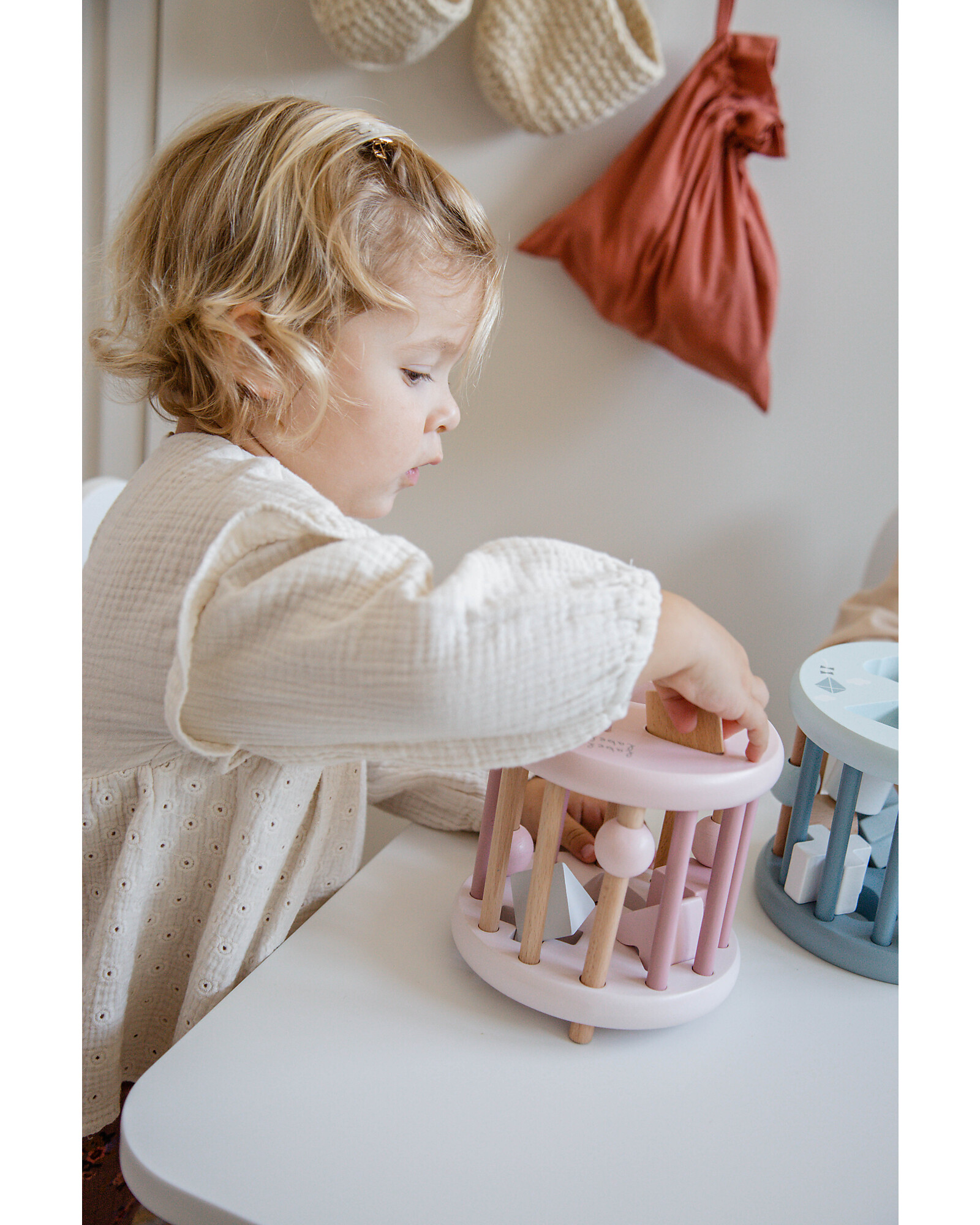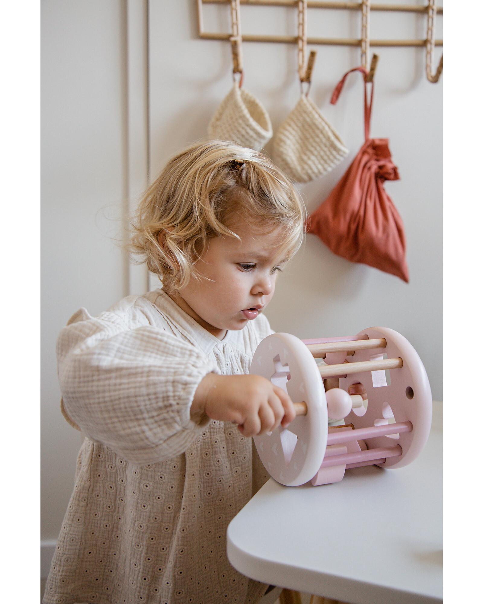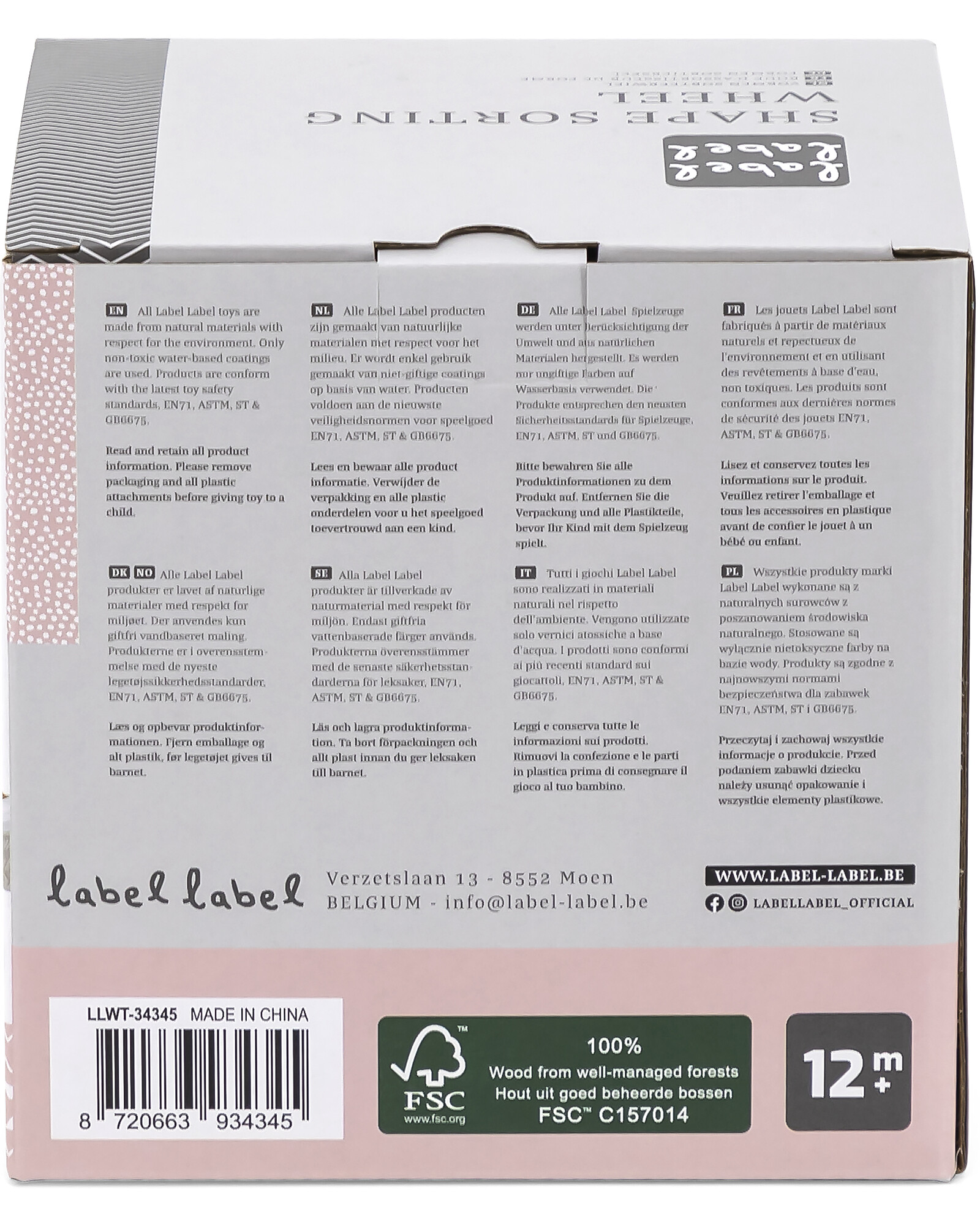 La Ruota con Forme Geometriche a Incastro di Label Label è un gioco educativo e divertente pensato per stimolare la curiosità e la coordinazione dei più piccoli. Realizzata in legno di faggio certificato FSC, garantisce resistenza, sicurezza e sostenibilità. La ruota contiene forme geometriche colorate da inserire negli appositi spazi, aiutando i bambini a riconoscere forme, colori e sequenze logiche. Una volta completata, può essere fatta rotolare, aggiungendo un ulteriore livello di gioco dinamico. Dipinta con vernici a base d’acqua, è completamente sicura. Il design curato e i colori tenui la rendono anche un bel complemento d’arredo.