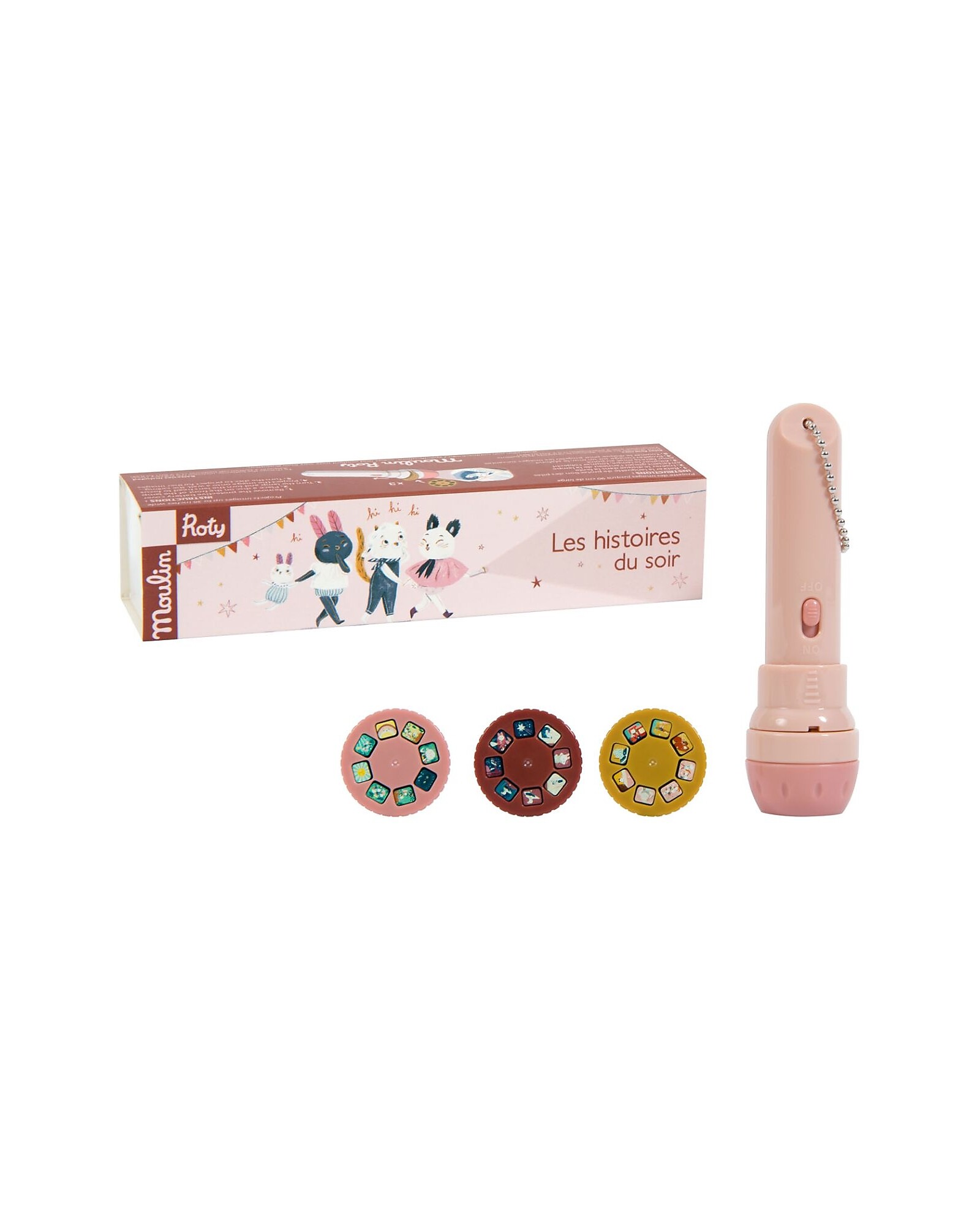 Le luci si spengono e la magia ha inizio. La torcia delle ombre proietta tre storie incantate, con 24 immagini su tre dischetti, da girare lentamente per cambiare scena. Ogni dischetto svela una nuova avventura di un gruppo di simpatici amici animali, pronti a coinvolgere i piccoli spettatori. Puoi proiettare le immagini dove vuoi: sul muro, sul soffitto, o su un telo bianco appeso alla finestra. I genitori possono ispirarsi per raccontare storie creative, o lasciare che sia il bambino a immaginare e inventare la sua narrazione. Un gioco che stimola la fantasia e la comunicazione.