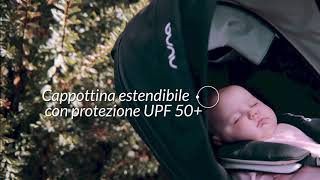 - Capottina: protezione UV 50+, idrorepellente, con visiera parasole e finestrella a rete