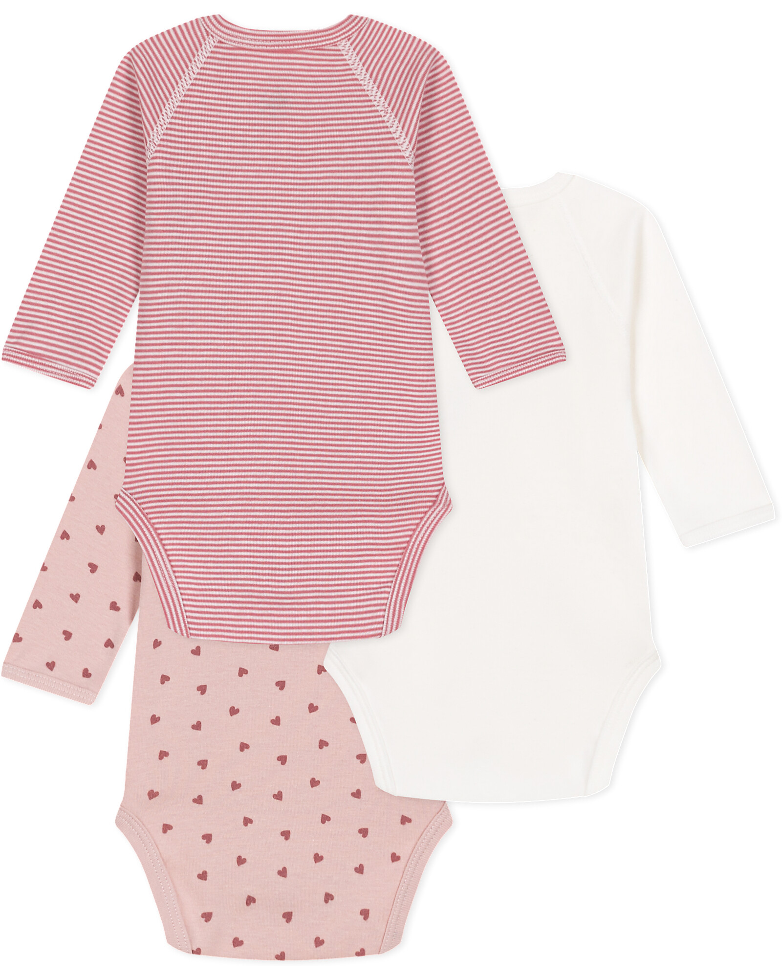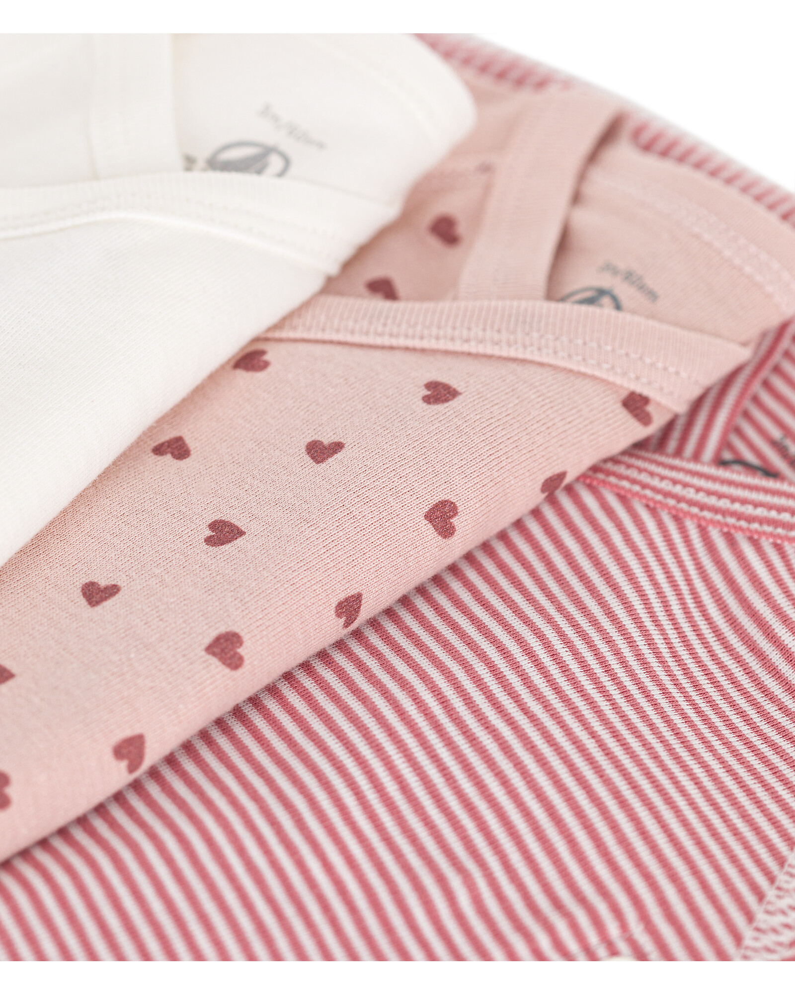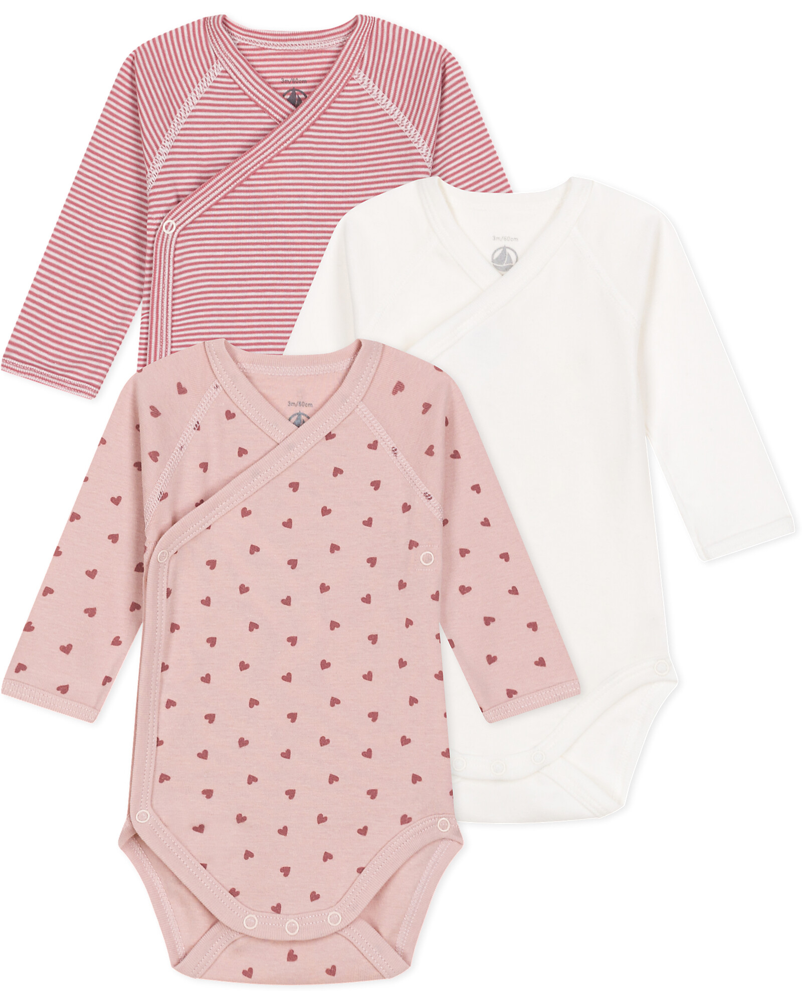 Body Kimono Manica Lunga - Pacco da 3 - Rosa e Bianco - Righe e Cuori - 100% Cotone Bio