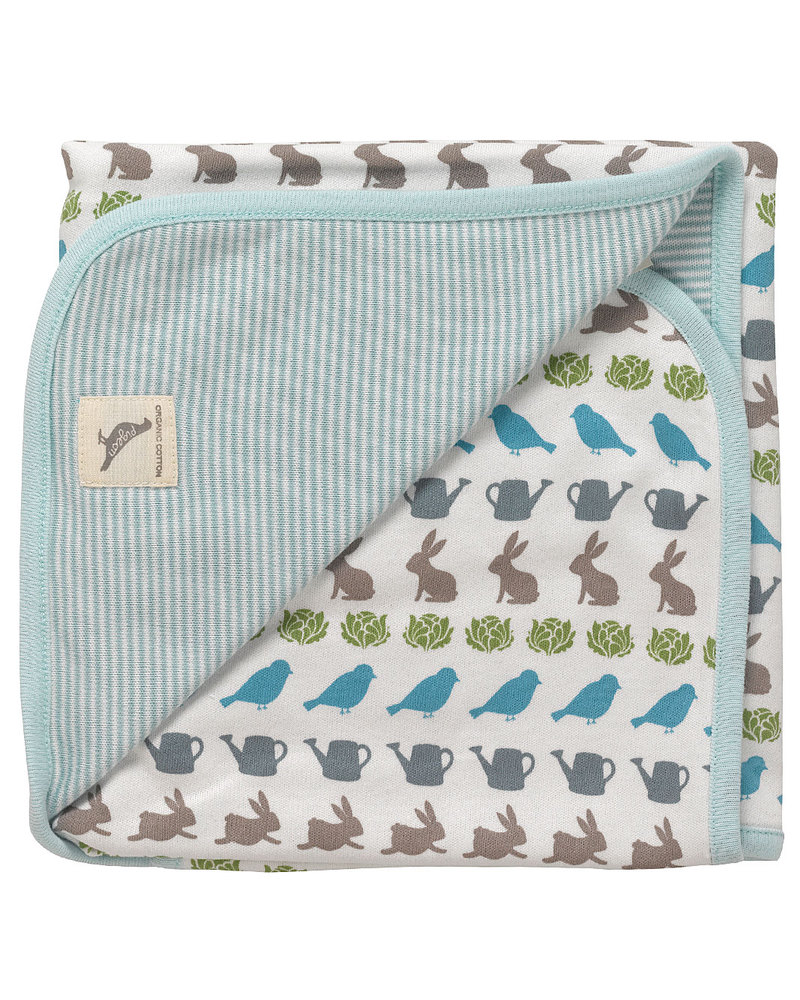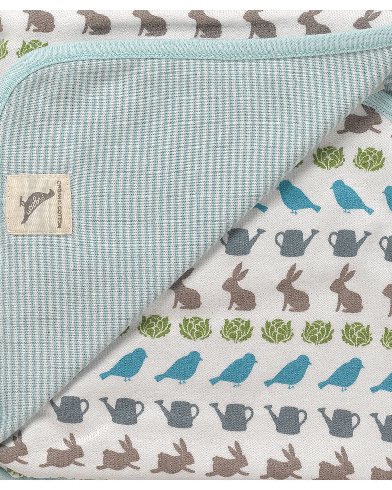 Meravigliosa copertina per culla o passeggino (72 x 70 cm)in doppio strato di Cotone Bio – morbido e sicuro sulla pelle del neonato del marchio Organics for Kids, che disegna e produce in Gran Bretagna abbigliamento per bambini dal gusto classico, ma con un design moderno. Dalla fantasia primaverile allegra sulle tonalità dell’azzurro, questa copertina è double face: da una parte una deliziosa fantasia con tanti uccellini, coniglietti e piccoli annaffiatoi su fondo bianco naturale; dall'altra parte una classica fantasia millerighe azzurra e bianca. Rifinita con un bordino azzurro a contrasto che la impreziosisce ancor di più! Perfetta per avvolgere la delicata pelle dei neonati, è un regalo di nascita ideale da sola o abbinata alla tutina della stessa linea Springtime di Organics for Kids.