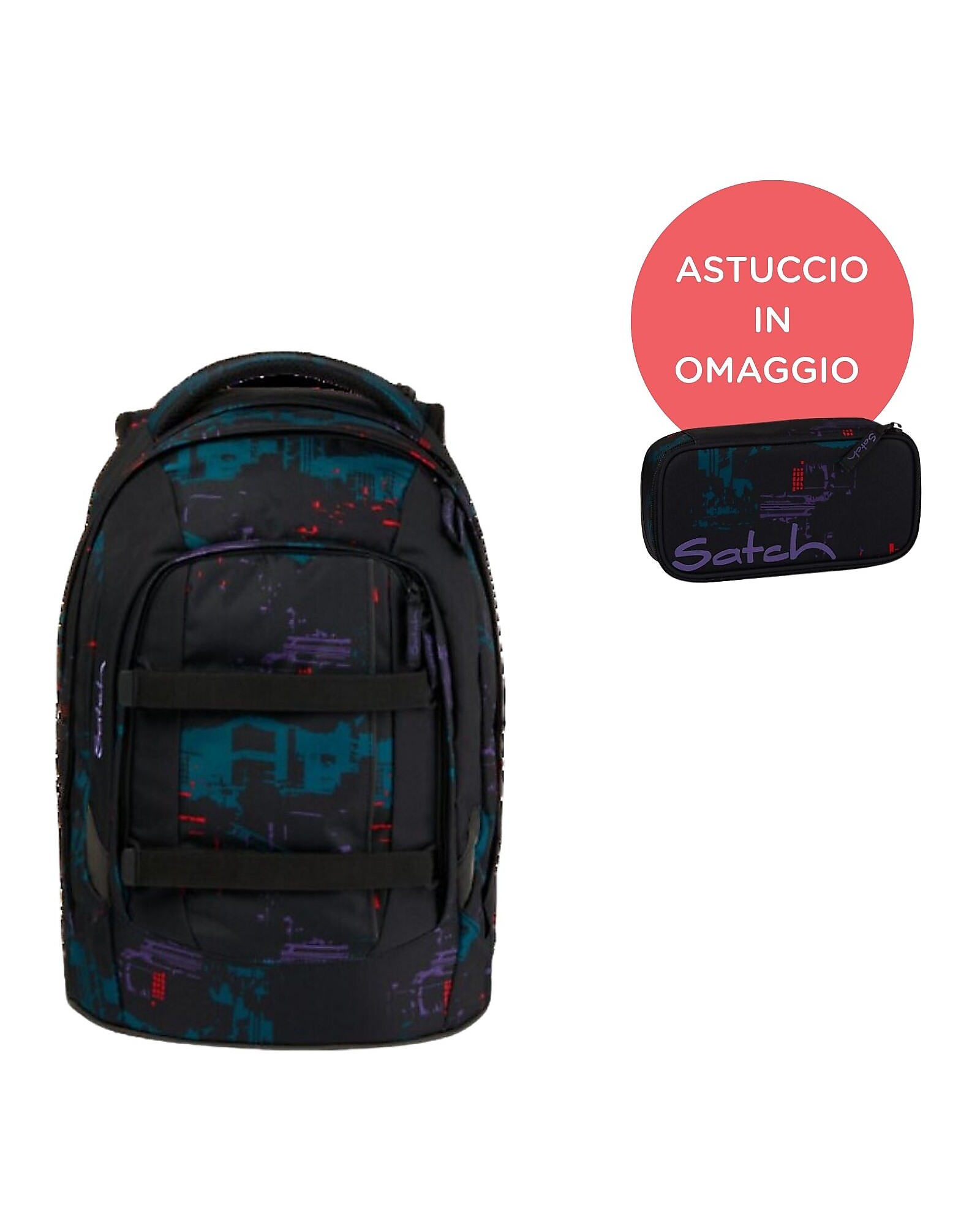 In omaggio, l’astuccio rigido Satch, con elastici colorati per penne e matite e scomparto divisorio con organizer, rende semplice e divertente l’organizzazione del materiale scolastico.