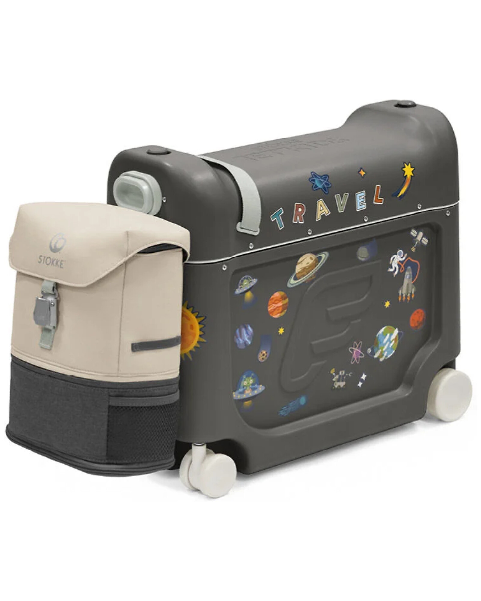 Il Set da viaggio JetKids di Stokke è composto da due accessori essenziali per i piccoli viaggiatori: la valigia-ride-on BedBox™ (che funge da bagaglio a mano, seduta su ruote e persino letto da viaggio) e lo zaino BackPack™, espandibile e pensato per esploratori da 2 a 7 anni.