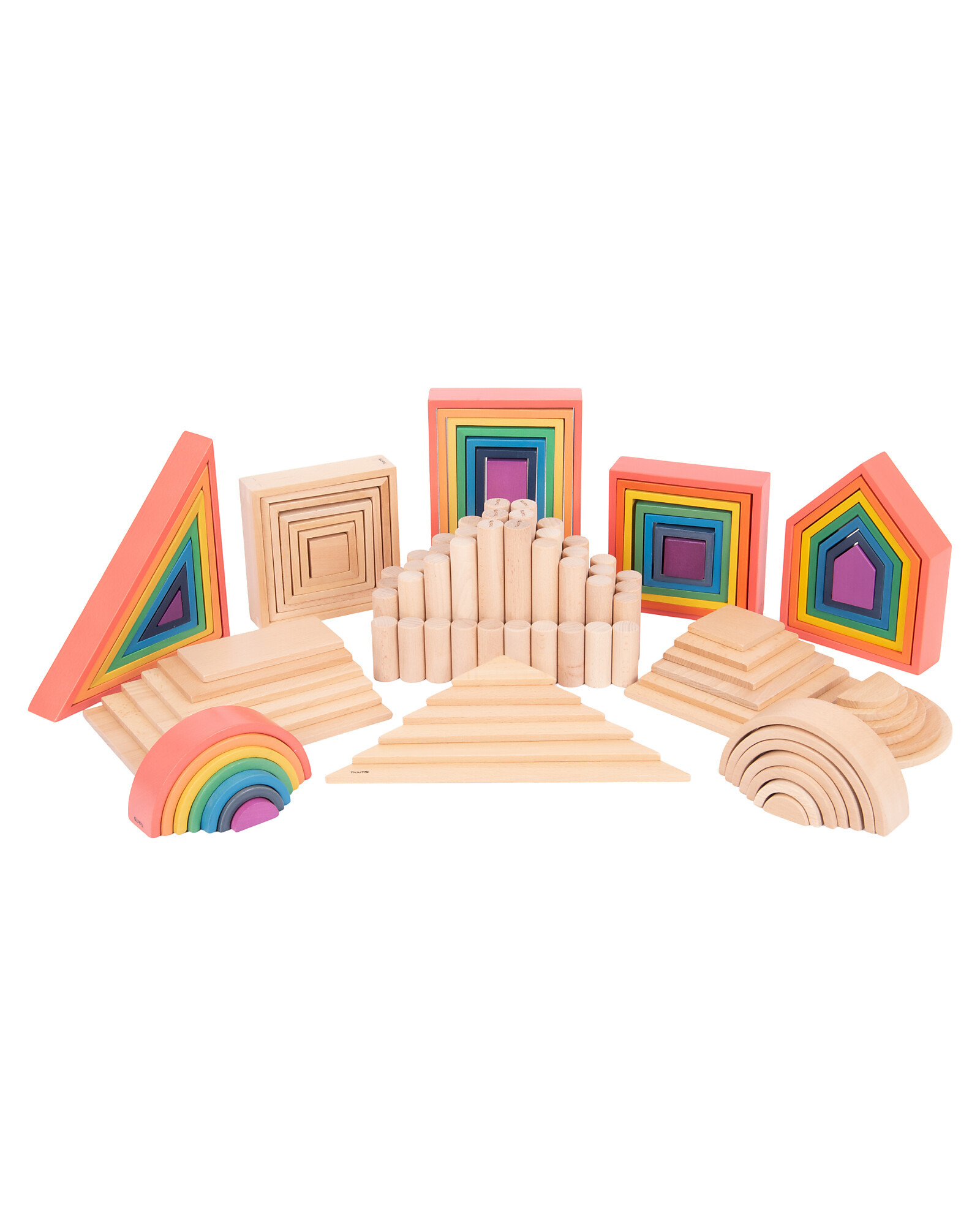Il tuo bambino ama costruire e costruire torri e strutture affascinanti? Allora adorerà il Set Architett Arcobaleno tickit® composto da quattro forme geometriche (quadrati, rettangoli, triangoli, archi) nidificate insieme con il blocco interno in ciascun gruppo di nidificazione che costituisce una forma 3D solida. Realizzati in bellissimo legno massello di faggio liscio con una finitura con venature del legno naturali in sette colori diversi, questi set di forme permetteranno al tuo bambino di liberare la propria creatività e innovazione.