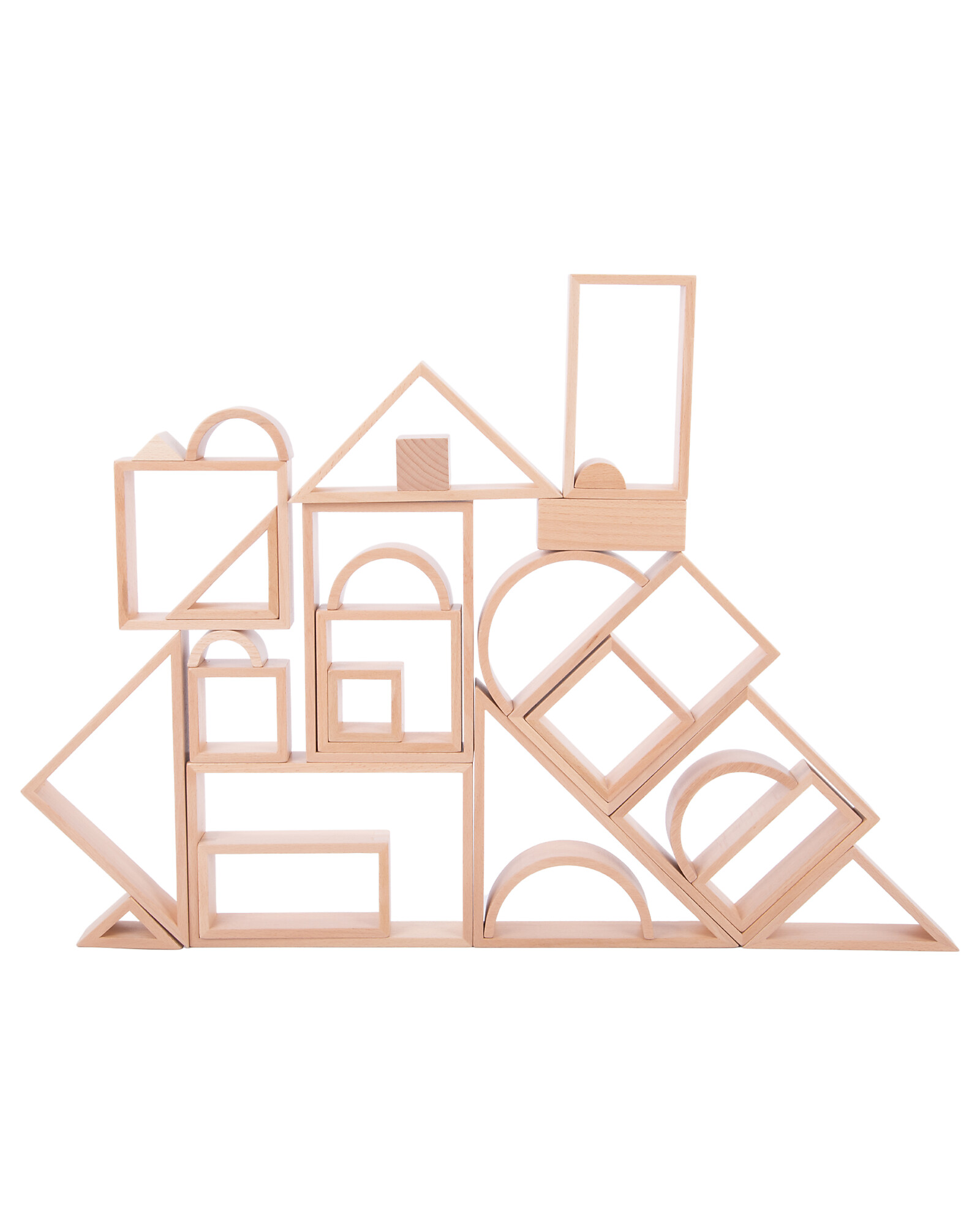 - Include: 28 forme in legno (4 forme geometrice e ciascuna in 7 dimensioni diverse) - Triangoli, quadrati, rettangoli, archi