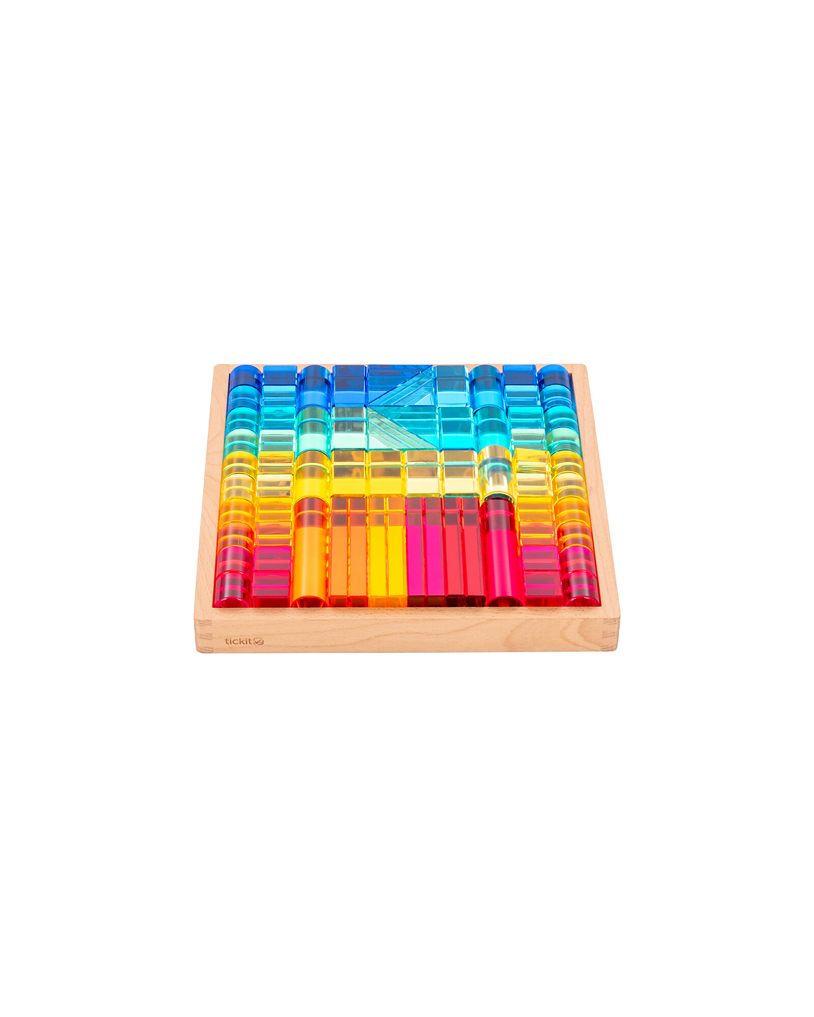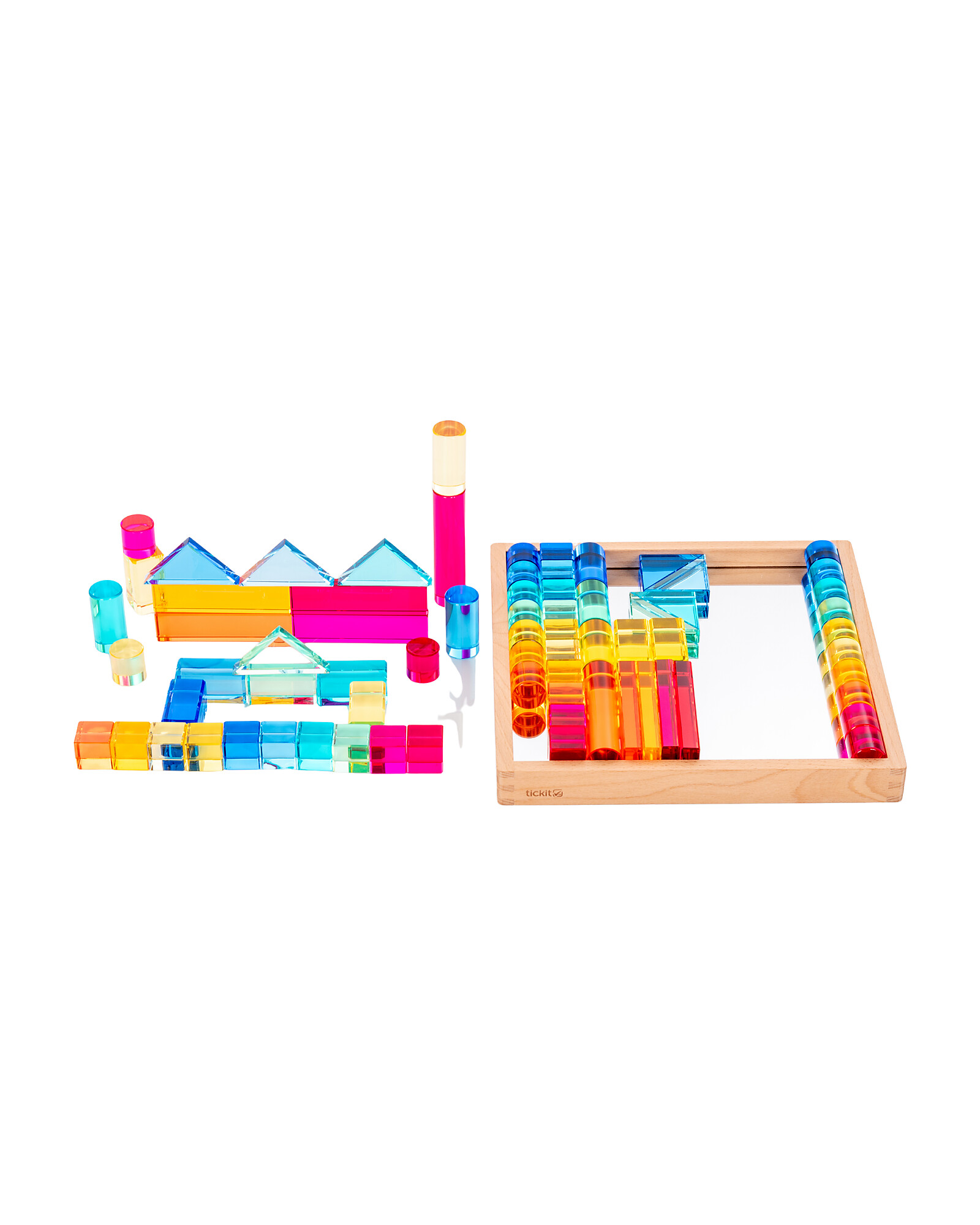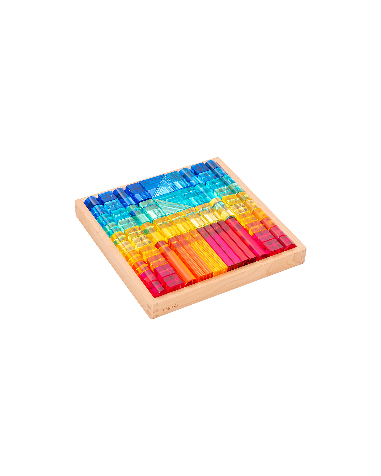 Tutti gli elementi si ripongono facilmente nel vassoio in legno di faggio certificato FSC, dotato di base in acrilico a specchio e multistrato, che aggiunge profondità visiva e valorizza le creazioni. Il set è inoltre compatibile con gli altri prodotti della gamma TickiT Gems, permettendo di espandere ulteriormente le possibilità di gioco.