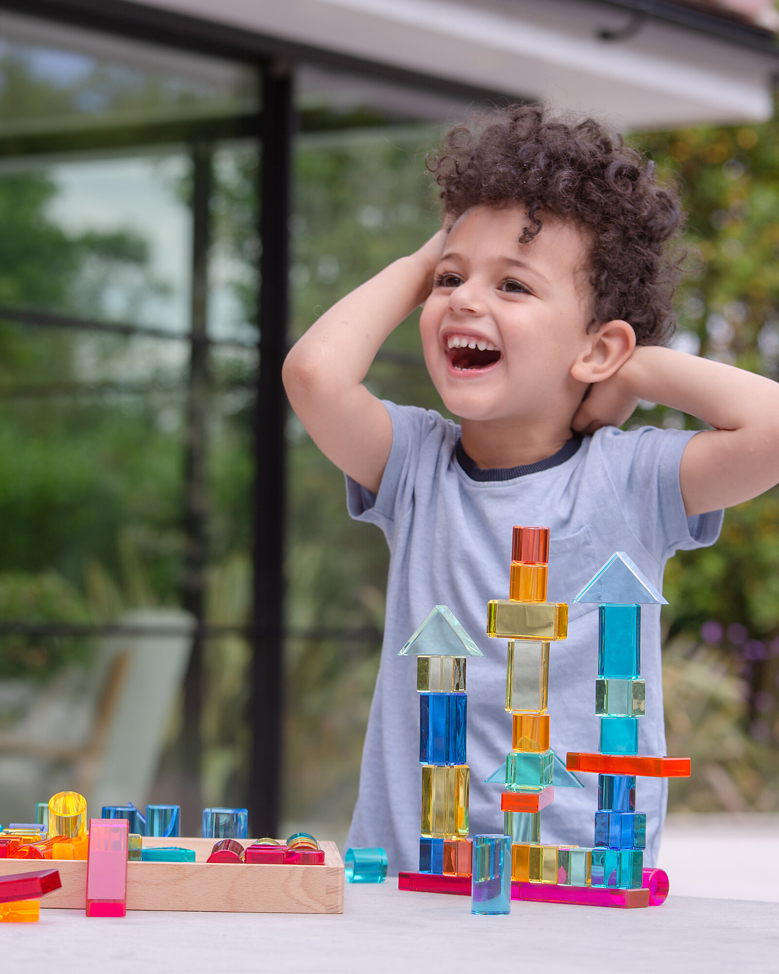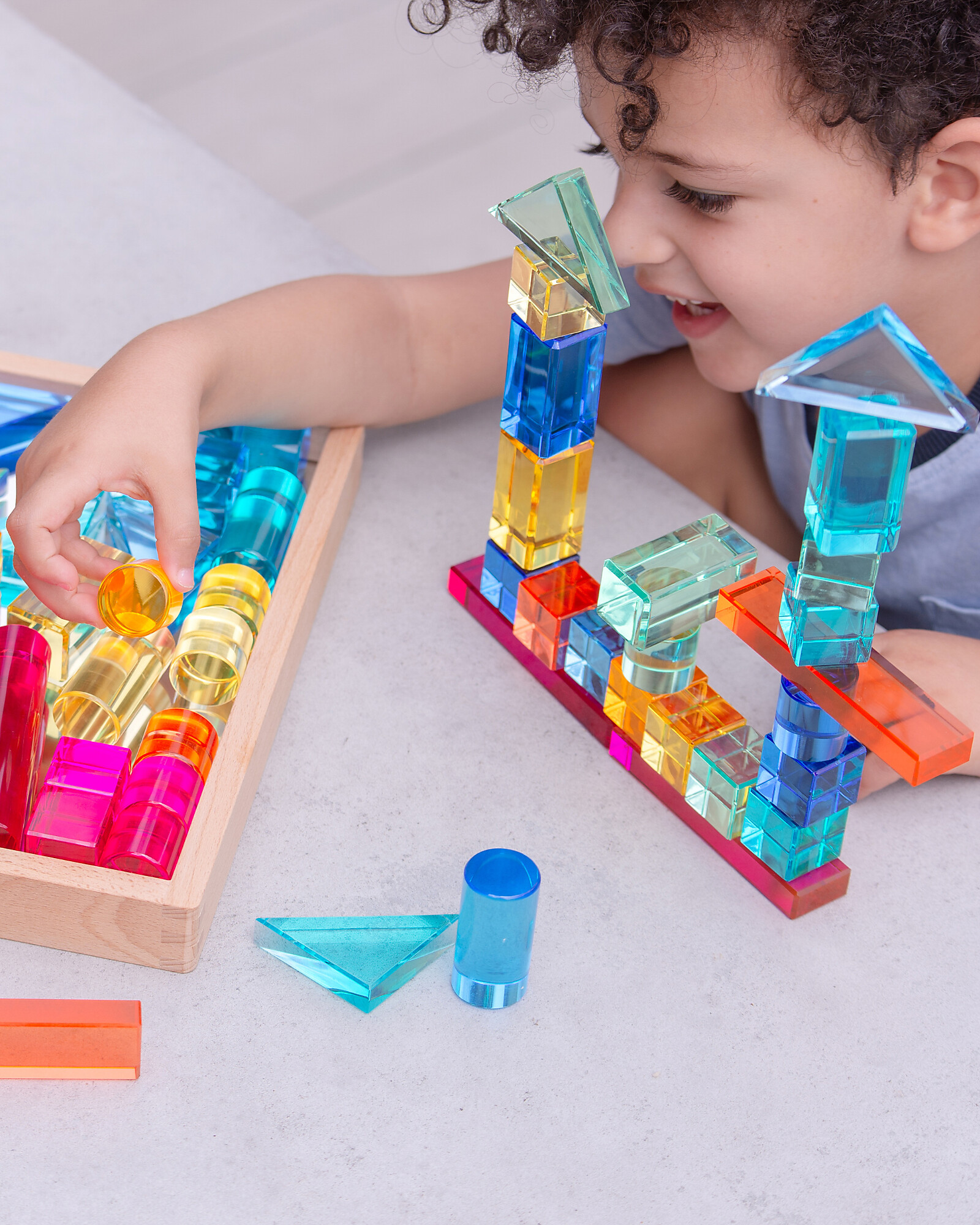 I cubi-gemma trasparenti aggiungono un elemento visivo affascinante, trasformandosi in finestre, porte decorative o dettagli colorati all’interno delle costruzioni. Questo arricchisce il gioco simbolico e favorisce lo sviluppo del linguaggio descrittivo e della narrazione.