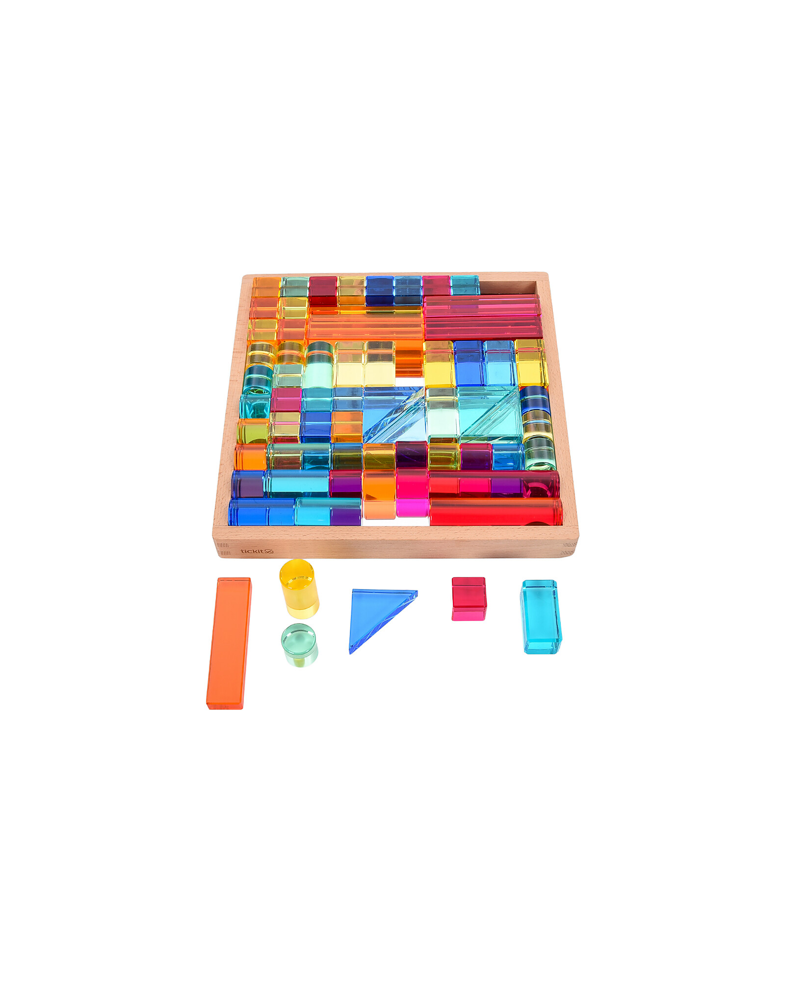 Libera la fantasia e la creatività con questo set di costruzioni in materiali misti con blocchi acrilici e gemme traslucide, progettato per offrire infinite possibilità di gioco e apprendimento. Le forme geometriche lisce in acrilico – tra cui cubi, cerchi, colonne, rettangoli, assi e triangoli – si combinano con luminosi cubi-gemma per dare vita a costruzioni uniche e sempre diverse.