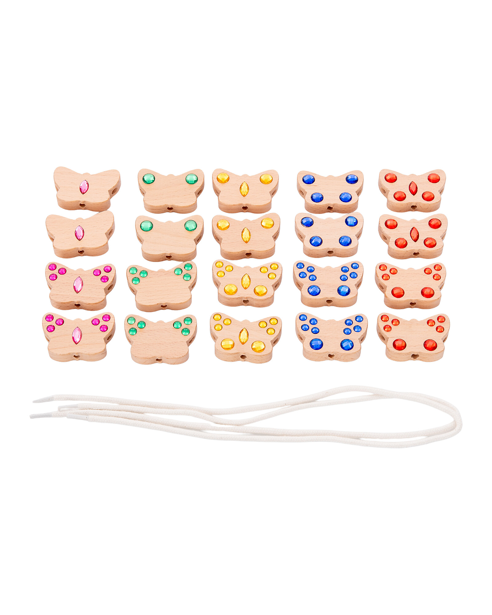 Inizia a imparare con questi deliziosi gioielli da infilare a forma di farfalla in legno. Realizzate in faggio certificato FSC, liscio e robusto, ogni farfalla presenta un numero unico di gemme sfaccettate e brillanti, da uno a dieci, creando una progressione visiva affascinante.
