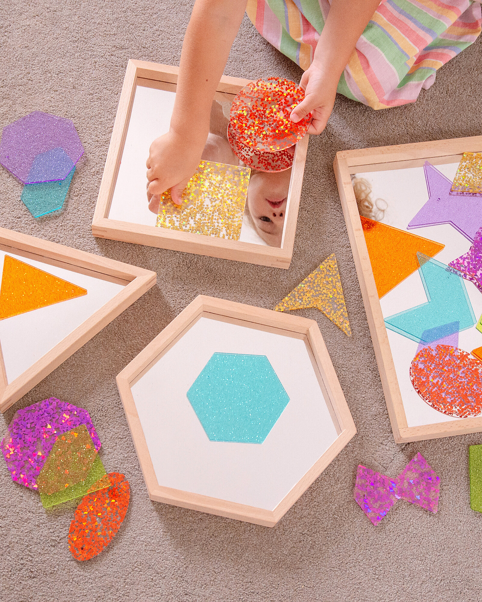Ogni vassoio è dotato di una base con specchio in acrilico da 2 mm, perfetta per permettere ai bambini di osservare il proprio riflesso, esplorare espressioni facciali e scoprire oggetti da prospettive nuove e sorprendenti. Questa interazione favorisce lo sviluppo della consapevolezza di sé, del linguaggio e delle capacità comunicative.