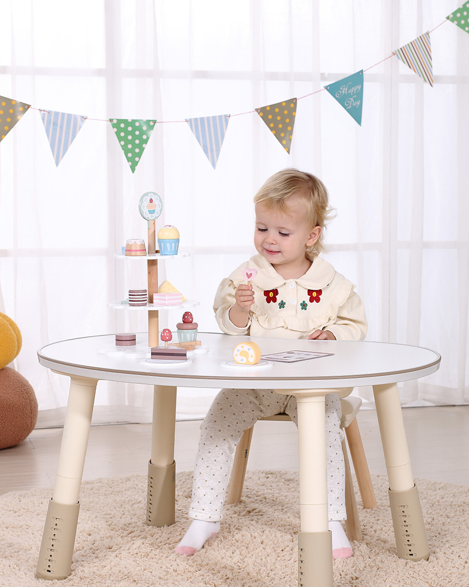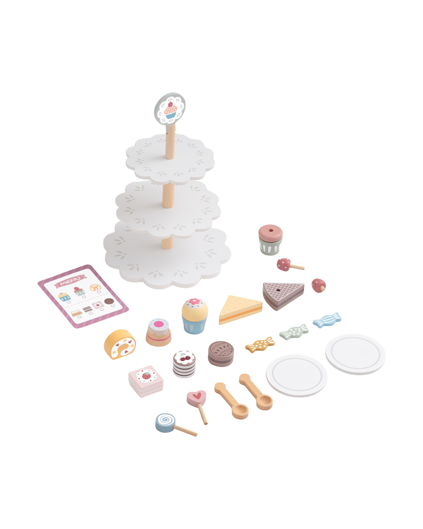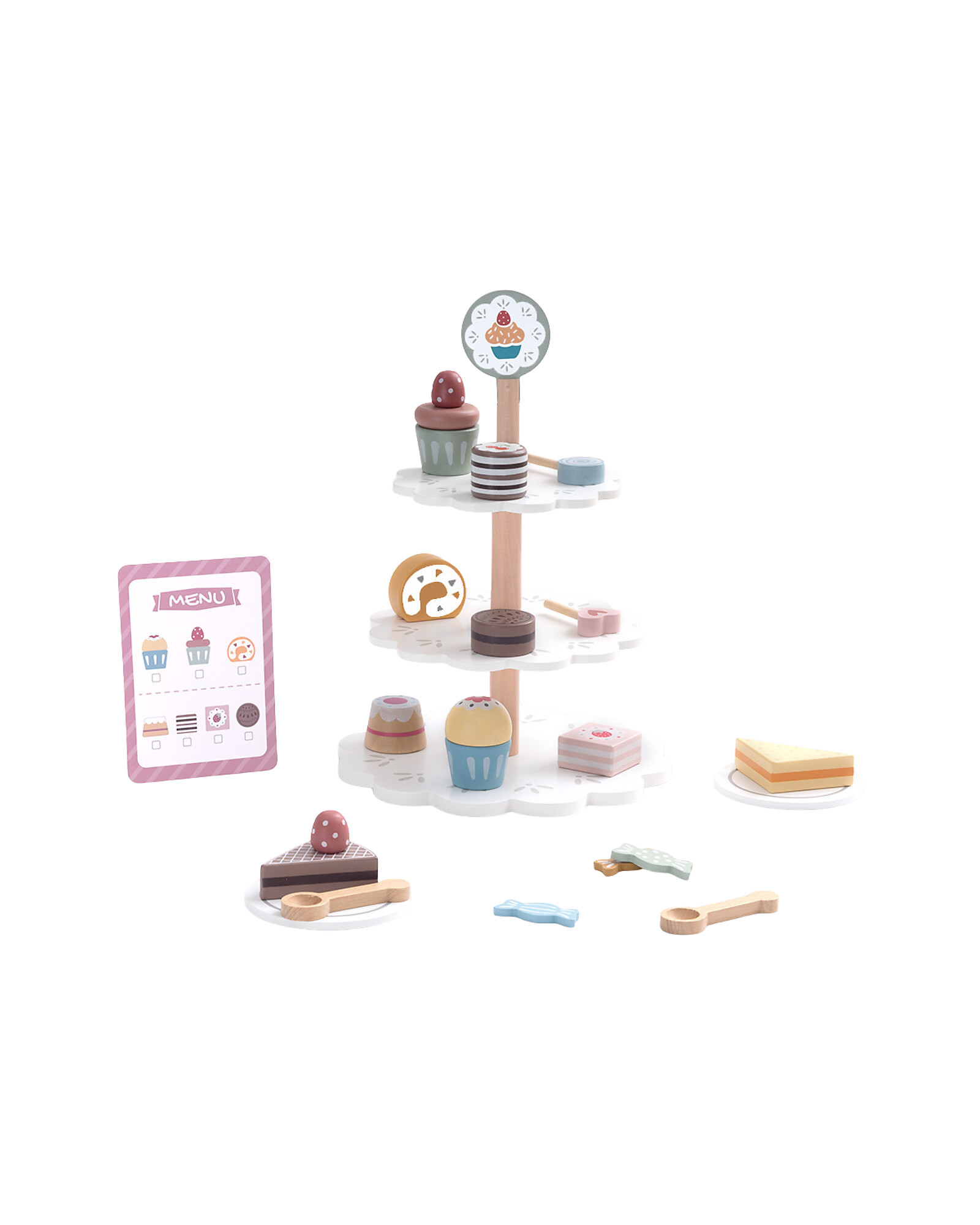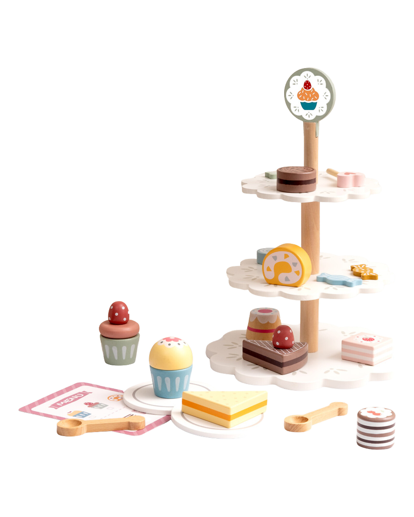 Benvenuti nella pasticceria dei sogni! Questa Alzatina per Dolci in Legno trasforma il gioco in arte pasticcera: con 22 elementi tra torte, muffin e decorazioni, i piccoli chef possono assemblare dolci fantastici e allestire vetrine da veri pasticceri. Il legno di ginepro e MDF garantiscono robustezza e colori brillanti. Il design goioso stimola la creatività visiva e il gioco simbolico. Un giocattolo delizioso, perfetto per i futuri pasticcieri!