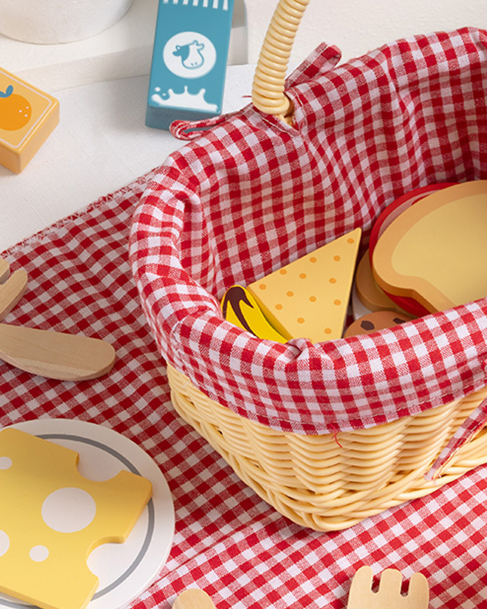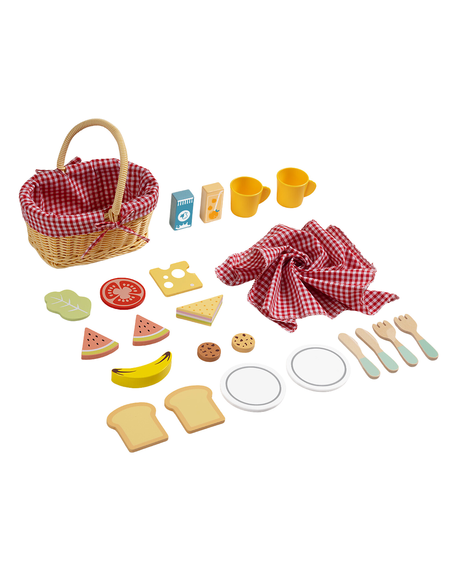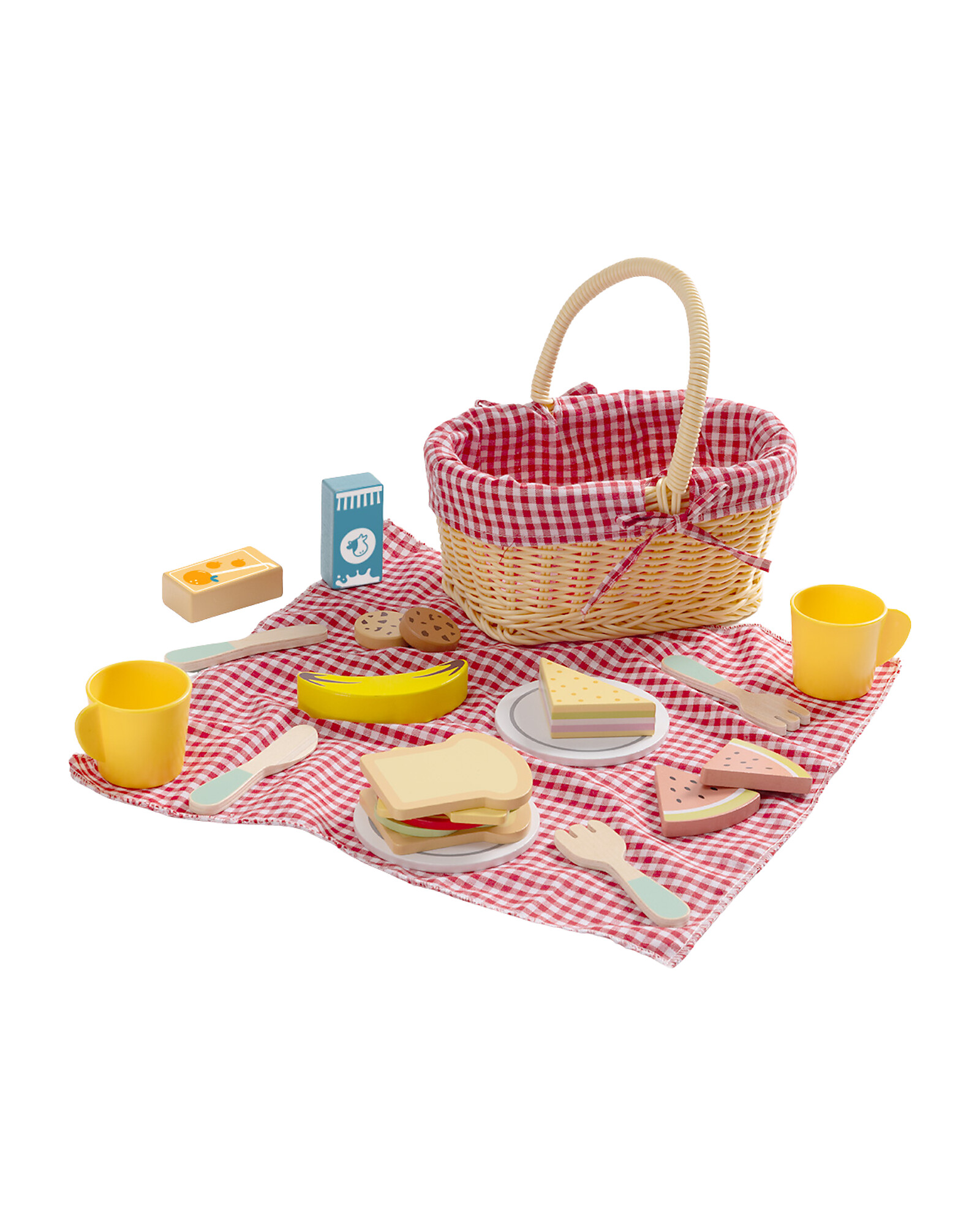 Pronti per il picnic perfetto! Questo Cestino da Picnic in Legno è il compagno ideale per le avventure dei bambini: con 23 accessori tra piatti, bicchieri, posate e alimenti giocattolo, ogni angolo diventa una sala da pranzo sotto il cielo aperto. Il compensato, il legno di ginepro e il tessuto garantiscono robustezza e fascino. Il design ispirato alla natura stimola il gioco simbolico e creativo. Un regalo delizioso, perfetto per i piccoli gourmet all’aria aperta!