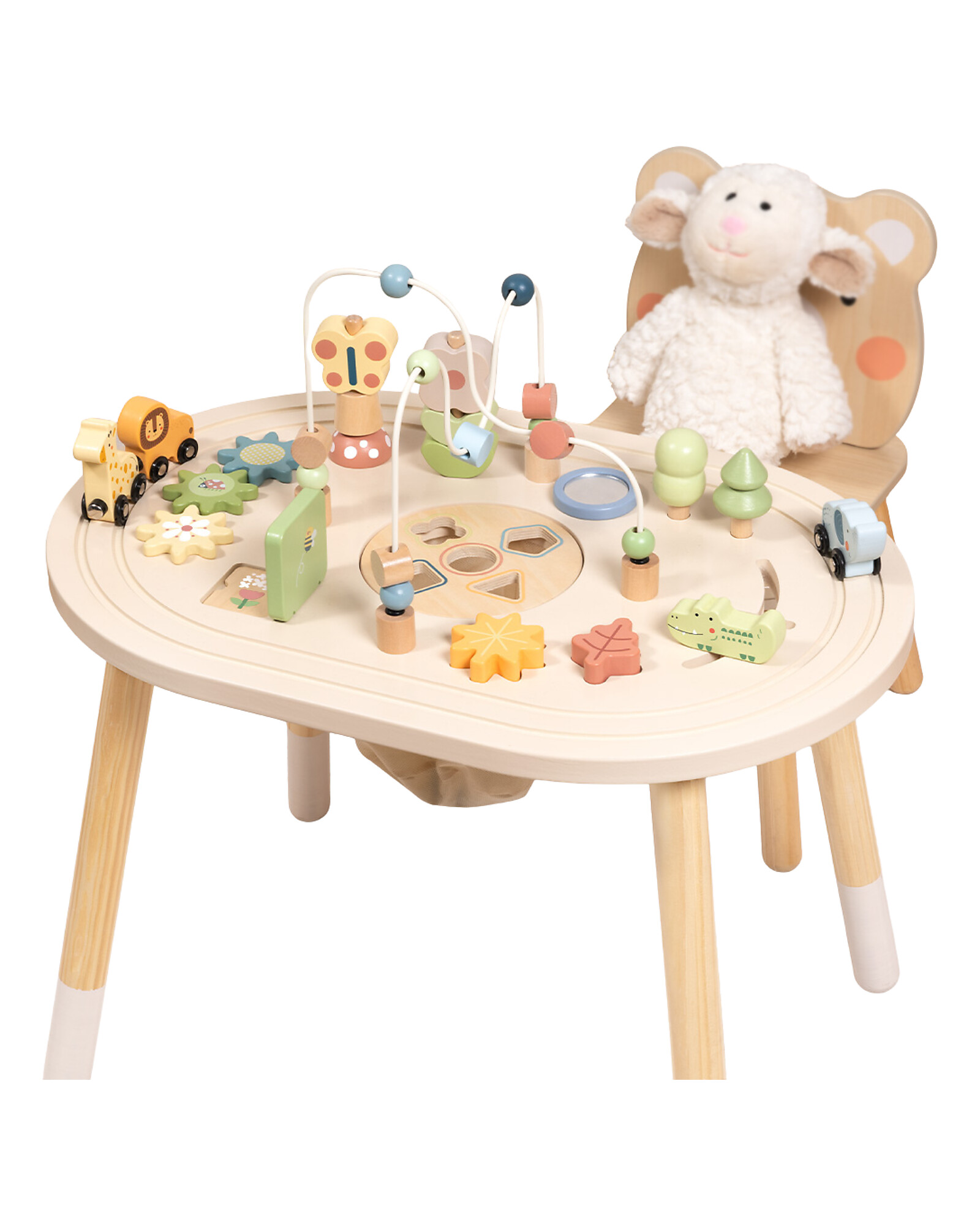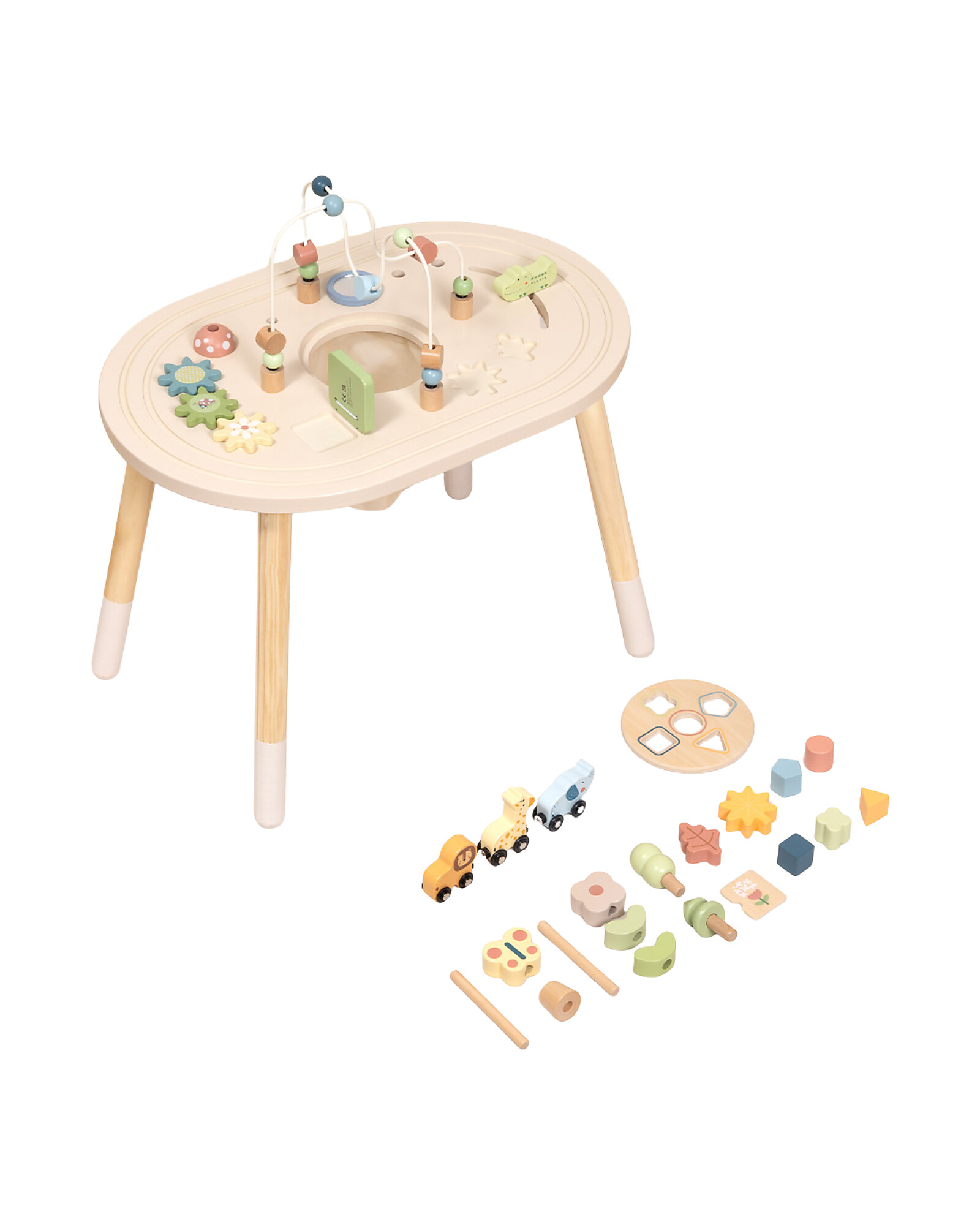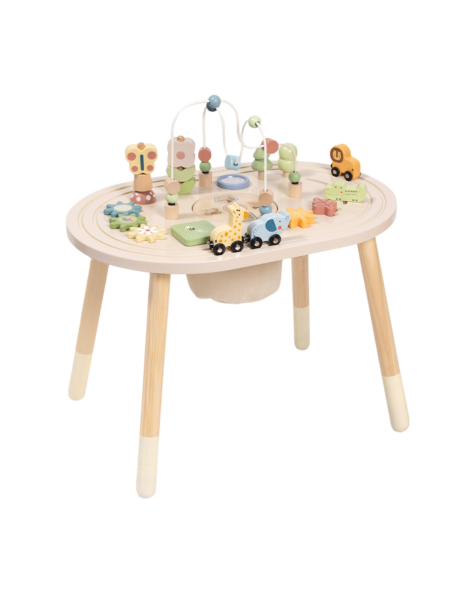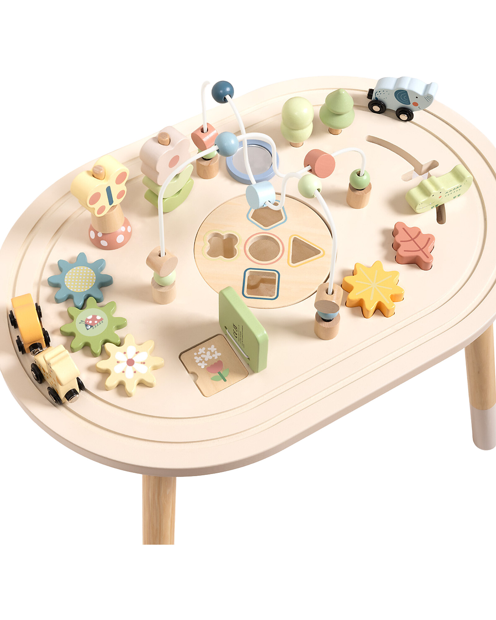 Un tavolino, mille possibilità! Questo Tavolino Ovale Multiattività è il centro giochi ideale per i bambini da 18 mesi: il piano ovale accoglie diverse attività educative integrate che stimolano la manualità, la logica e la creatività. La struttura in compensato e MDF è stabile, sicura e duratura. Il design moderno si integra perfettamente in qualsiasi cameretta. Un giocattolo multifunzione e stimolante, perfetto per accompagnare la crescita a 360°!