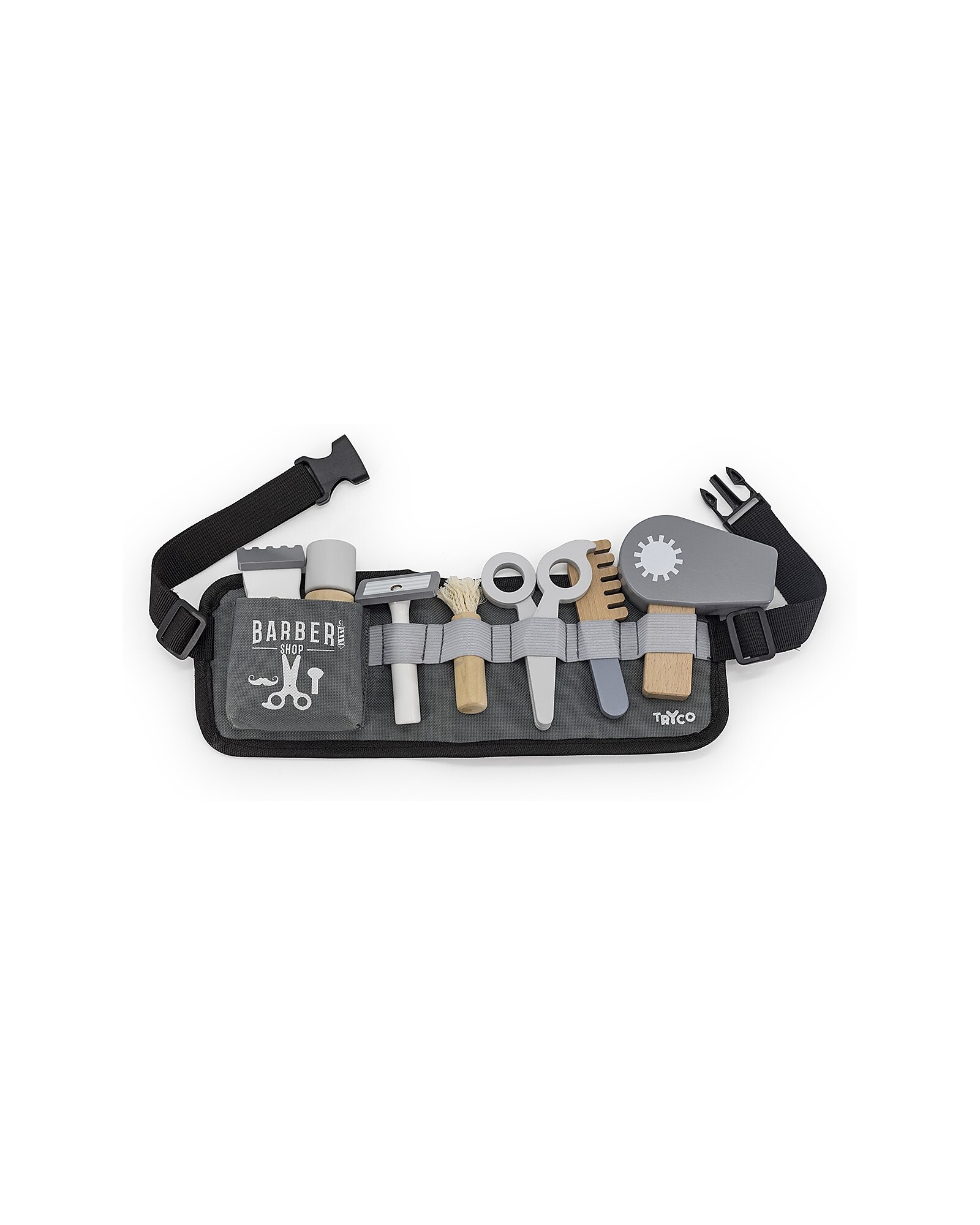 - Include: Cintura porta attrezzi, forbici, phon, pettine, pennello, spray, rasoio e lametta in legno