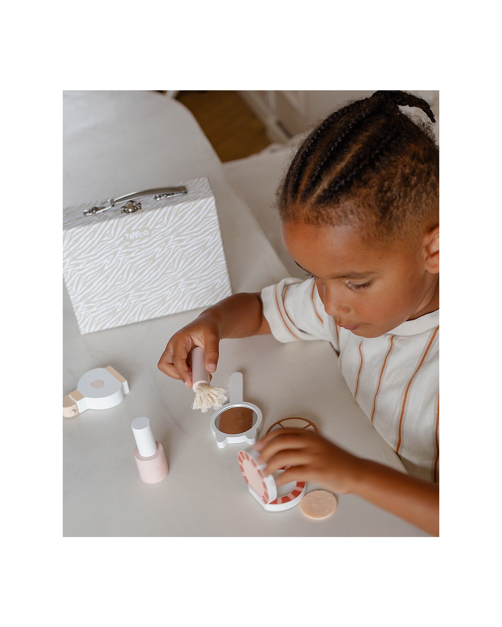 Il Set Trucco in legno con valigetta è il gioco perfetto per i piccoli amanti dell’imitazione, ideale dai 3 anni in su. Realizzata in legno resistente e sicuro, include tutto il necessario per ricreare un vero angolo beauty: profumo, specchio, ombretto, smalto, rossetto, blush e pennello. I colori ad acqua atossici garantiscono la massima sicurezza, mentre il design multicolore rende l’esperienza ancora più divertente. Grazie alla pratica valigetta, il set può essere facilmente trasportato ovunque, per giocare dentro e fuori casa.