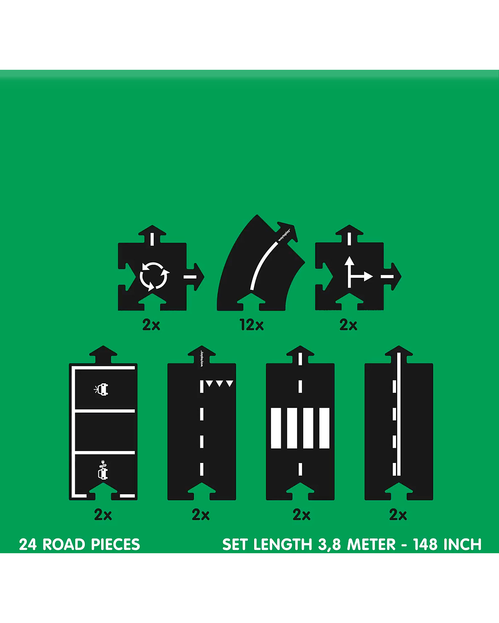 - Include 24 pezzi: 12 curve, 8 parti dritte, 2 incroci and 2 rotonde.